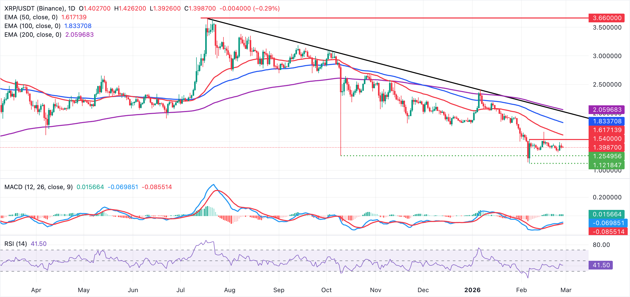 Still, the MACD indicator remains below its signal line, as green histogram bars stabilize, reinforcing a rather cautious bullish outlook. Traders will watch for a daily close above $1.40, which would likely pave the way for a breakout toward the February 6 high of $1.54.