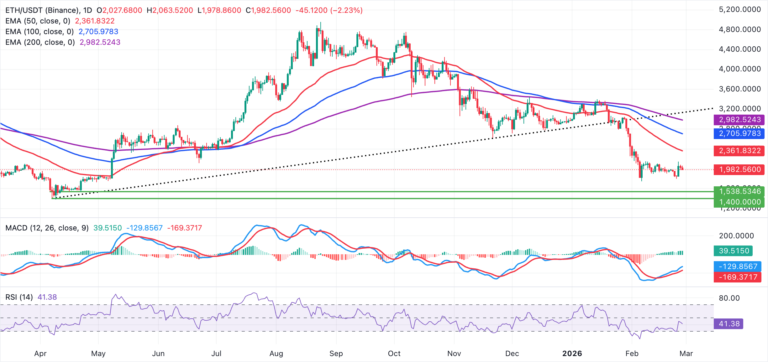 Ethereum is trading below the pivotal $2,000 level, affirming a near-term bearish bias while investors turn cautiously bullish after the token rebounded from its weekly low at $1,800.