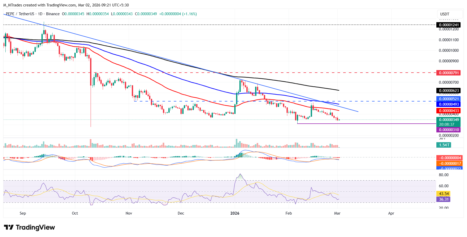 If PEPE continues its correction, it could extend the decline toward the February 6 low of $0.0000031.