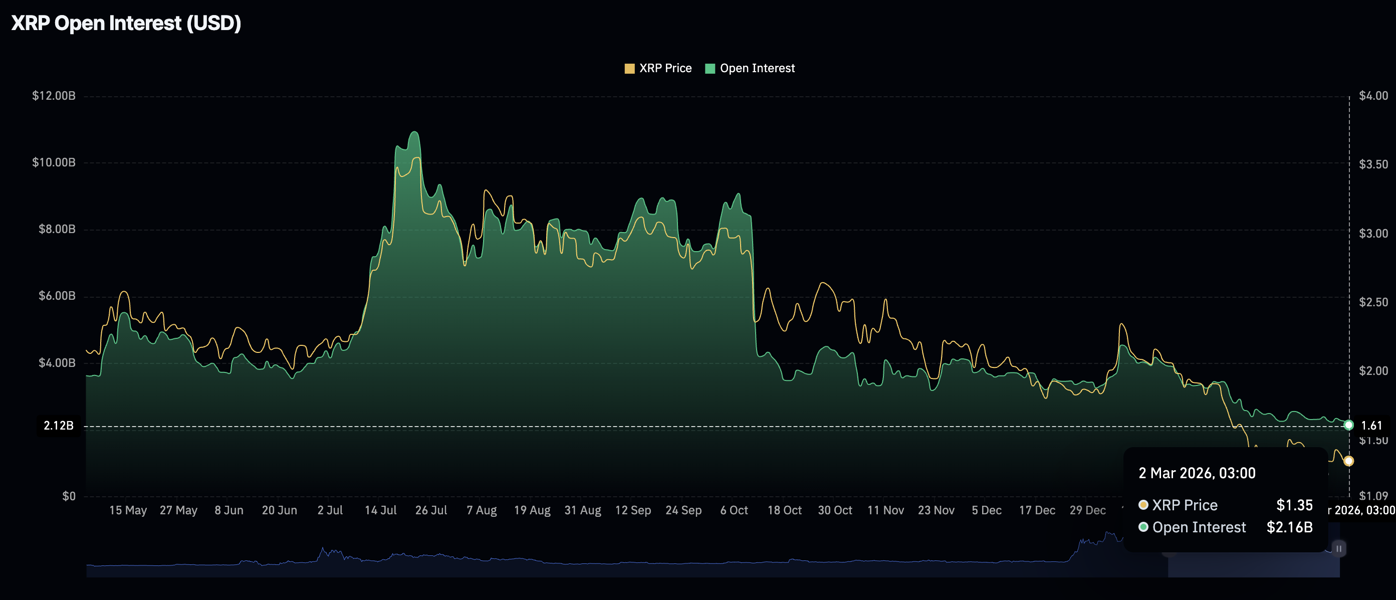 Retail investor interest in XRP has persistently waned, as evidenced by a significant slump in derivatives activity. CoinGlass data shows that the drop in futures Open Interest (OI) to $2.16 billion on Monday, from $2.26 billion the previous day, undermines risk appetite. The OI is at its lowest level since January 2025.