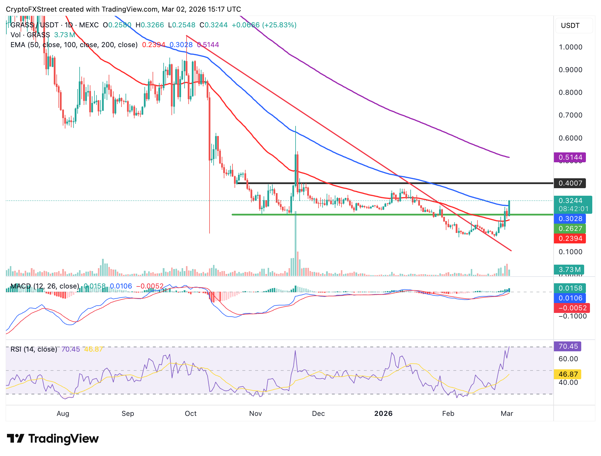 Grass is largely in bullish hands, sitting above the 50-day Exponential Moving Average (EMA) at $0.24 and the 100-day EMA at $0.30. The Relative Strength Index (RSI) is rising to 70 on the daily chart, indicating a steady bullish momentum.