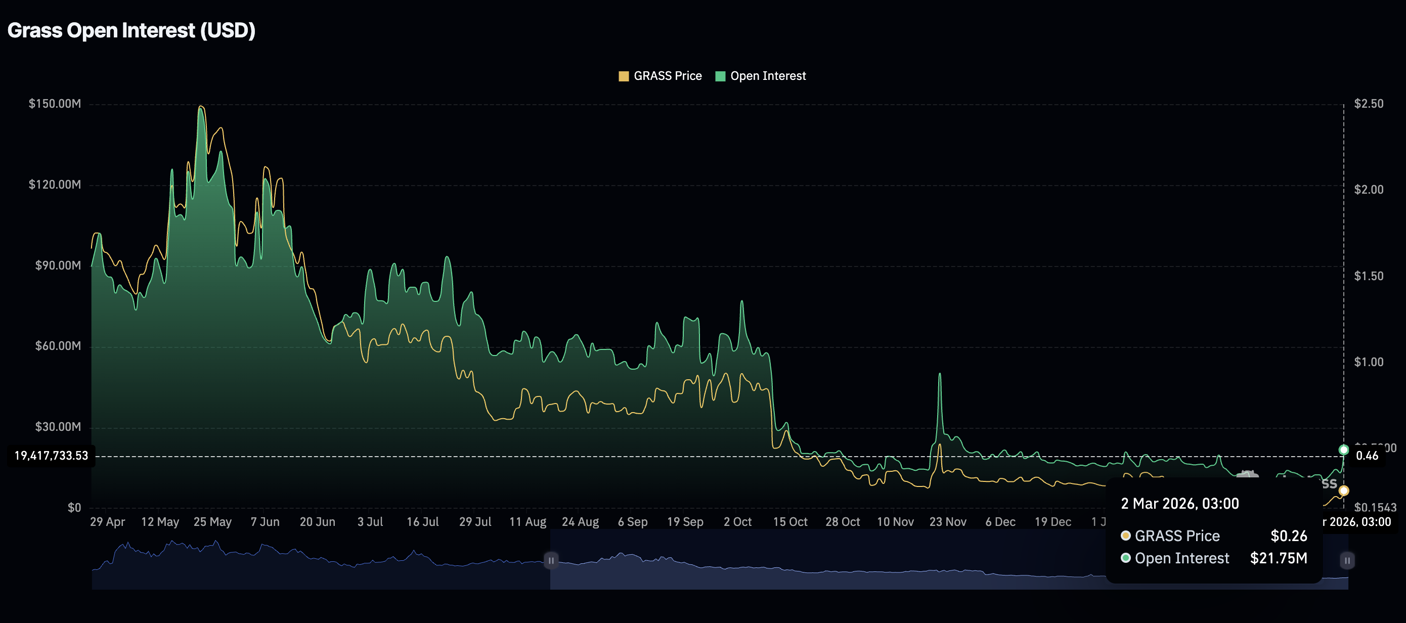 In contrast, the OI had faded to approximately $10.63 million last Tuesday. The same OI peaked at $148 million in May, when Grass traded around $2.60, underscoring the role of retail investors.