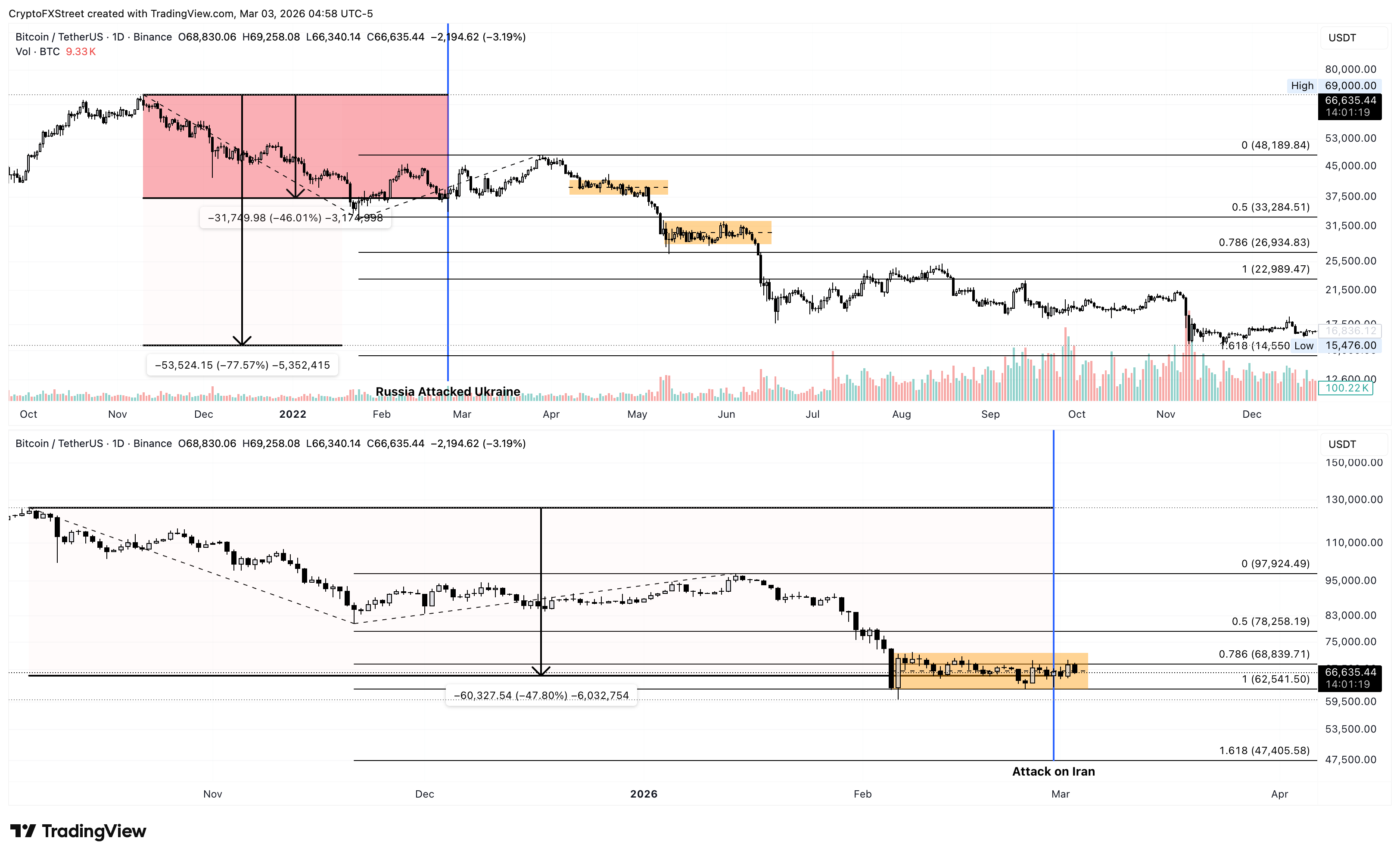 • Bitcoin remains below $70,000 amid the ongoing US-Iran war, while the 2022 price action during the Russia-Ukraine crisis warns deeper correction.