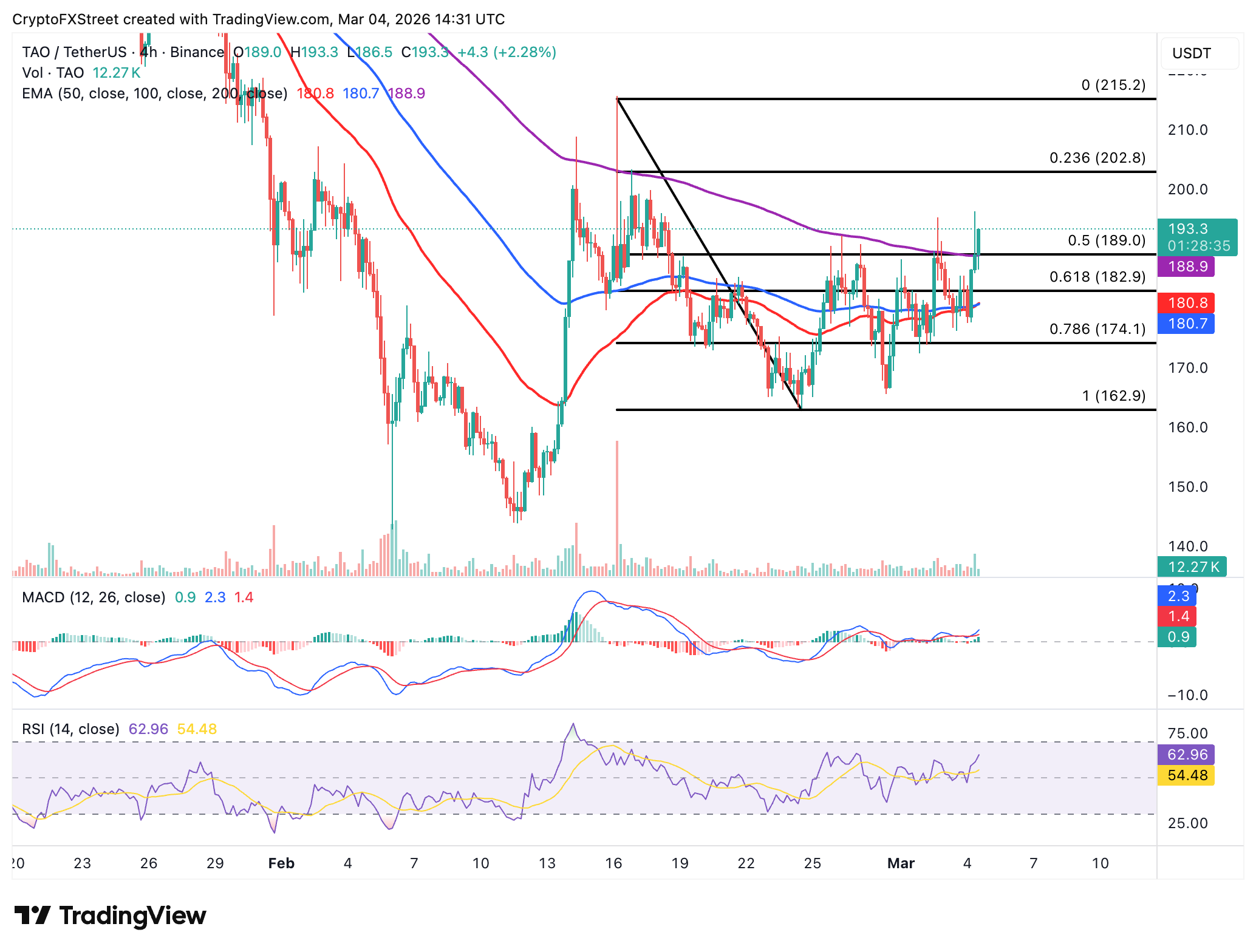 Bittensor is drifting higher above the 50, 100, and 200 Exponential Moving Average (EMAs) cluster between $181 and $189 on the 4-hour chart. The 200 EMA serves as immediate support as the bulls eye an extension of the recovery toward the psychological $200 threshold.
