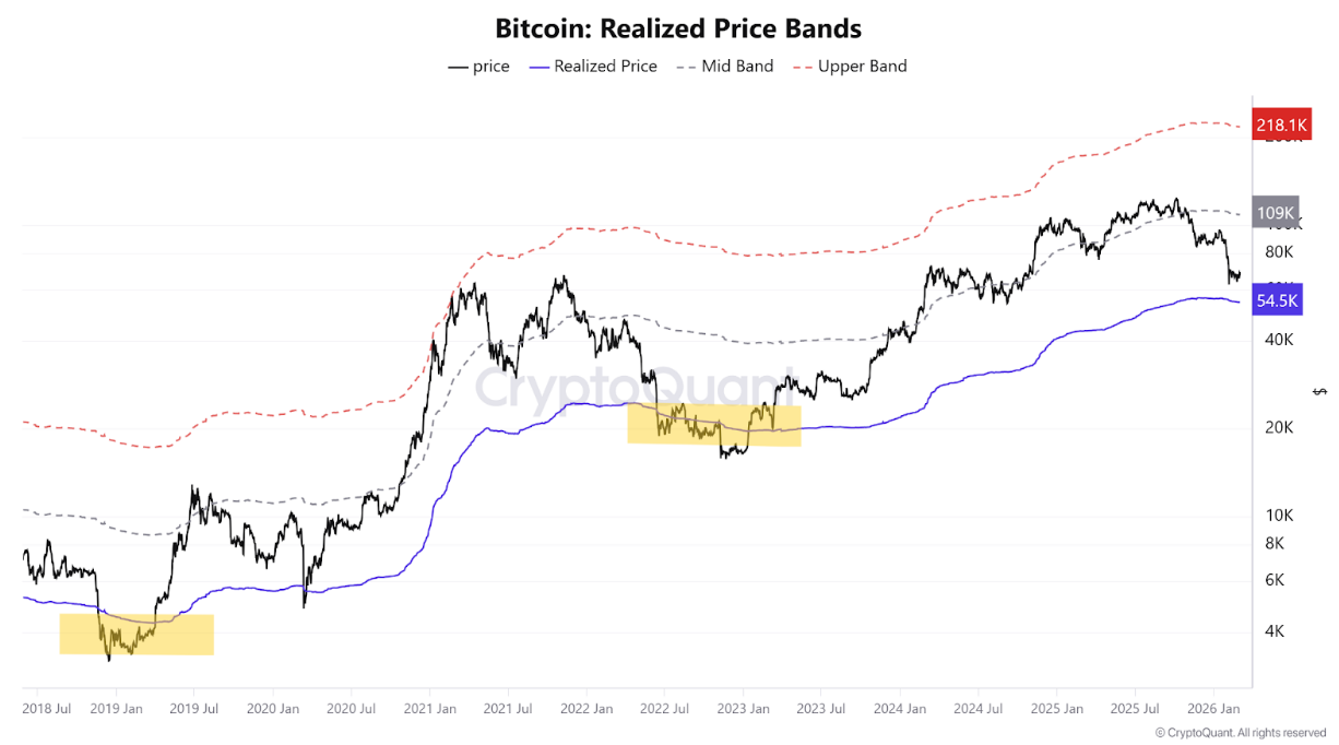 Key valuation metrics point to a possible bottom for BTC around $56,500. This estimate comes after analyzing Bitcoin’s realized price bands, which have historically served as major support areas during previous bear markets (see chart below).