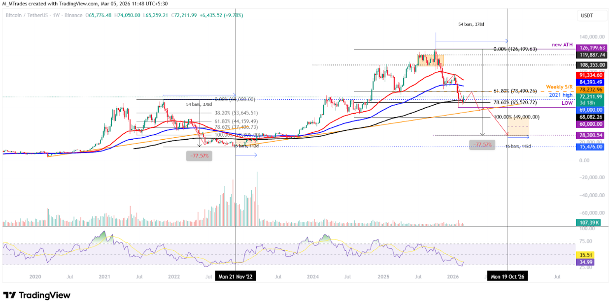 The Bitcoin weekly chart shows price action resembling that of the late-2021 and 2022 bear market.
