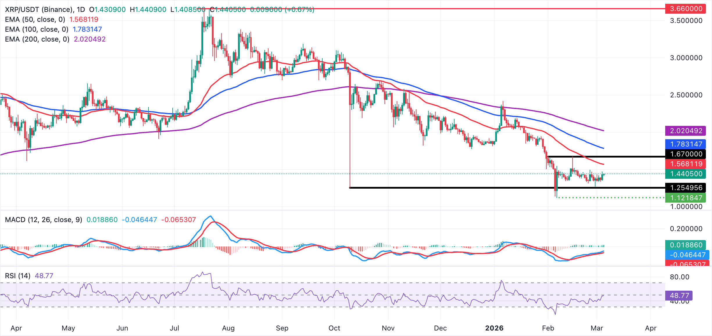 Initial resistance emerges near $1.47, aligning with Thursday's high. The 50-day EMA at $1.57 is a stronger barrier that could constrain the XRP price. On the downside, immediate support sits around $1.41, the daily low, with a break exposing the next bearish target near $1.35.