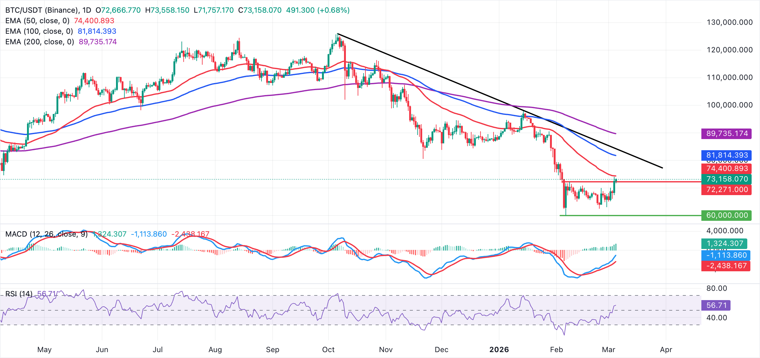 Bitcoin hovers above $73,000, with the near-term bias turning mildly bullish after breaking above the pivotal $70,000 level. The overall short-term momentum aligns with this improving tone as the Moving Average Convergence Divergence (MACD) remains above its signal line on the daily chart. Green histogram bars are expanding, likely prompting traders to increase their exposure.
