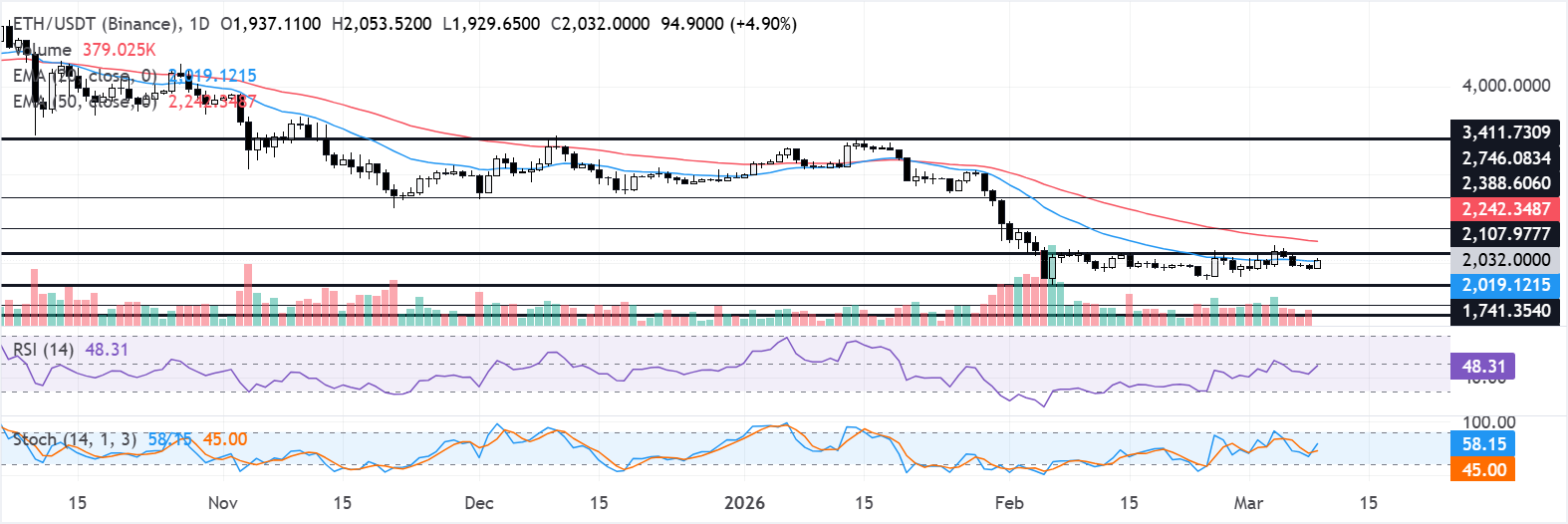 In the daily chart, ETH trades at $2,032. The near-term bias is cautiously neutral, with a downside tilt, as price holds below the 20-day and 50-day Exponential Moving Averages (EMAs), which cap the upside and frame the broader downtrend. Momentum has improved from oversold conditions, with the Relative Strength Index (RSI) recovering toward the mid-40s and Stochastic Oscillator (Stoch) lifting away from prior lows, but neither confirms a sustained bullish reversal.