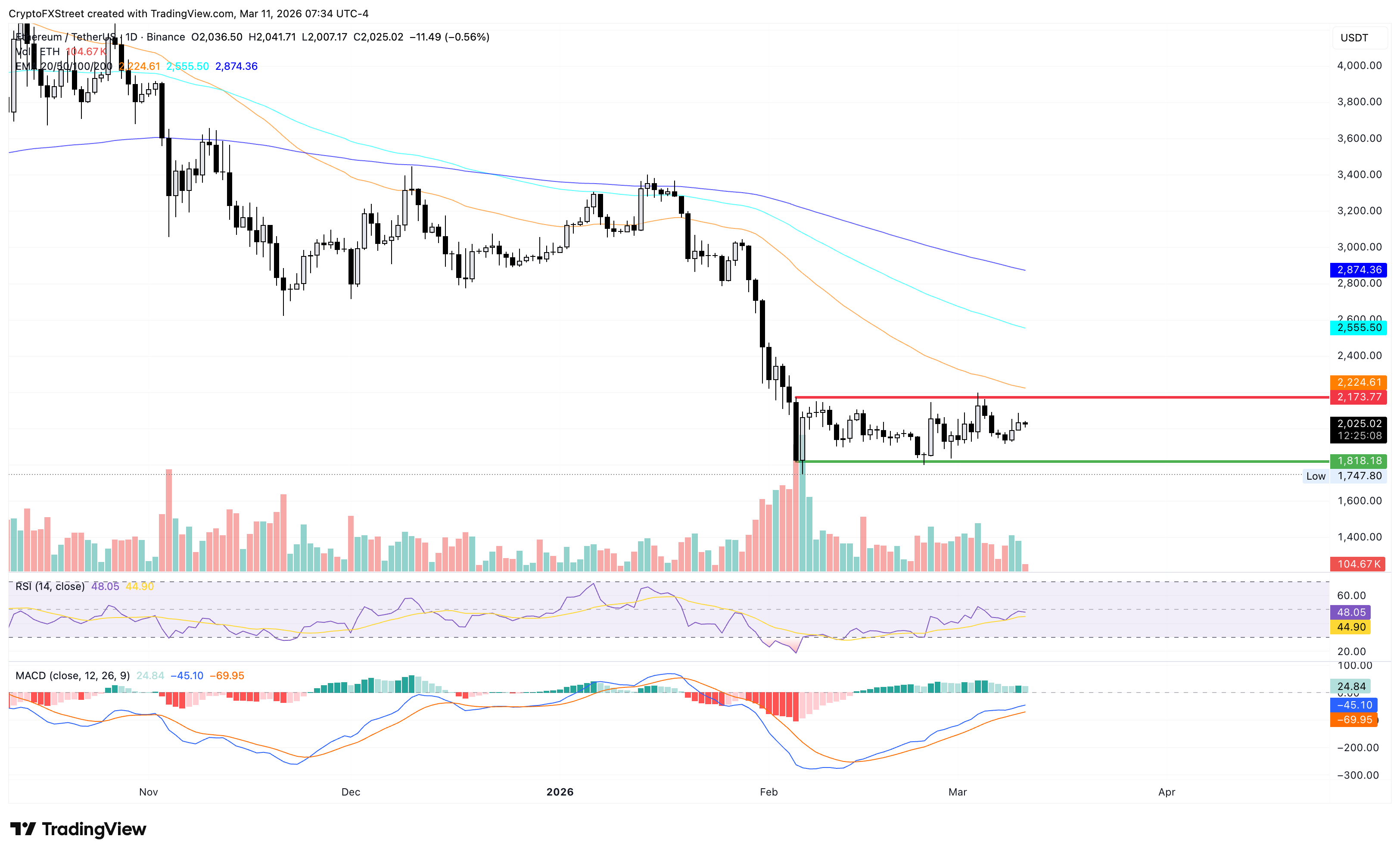 Ethereum is trading above $2,000 at the time of writing on Wednesday, trading in the red after a two-day recovery. ETH has been consolidating within the February 5 price range, from $1,818 to $2,173, keeping the near-term bias neutral. However, the descending 50-, 100-, and 200-day EMAs skew the broader trend bearish.