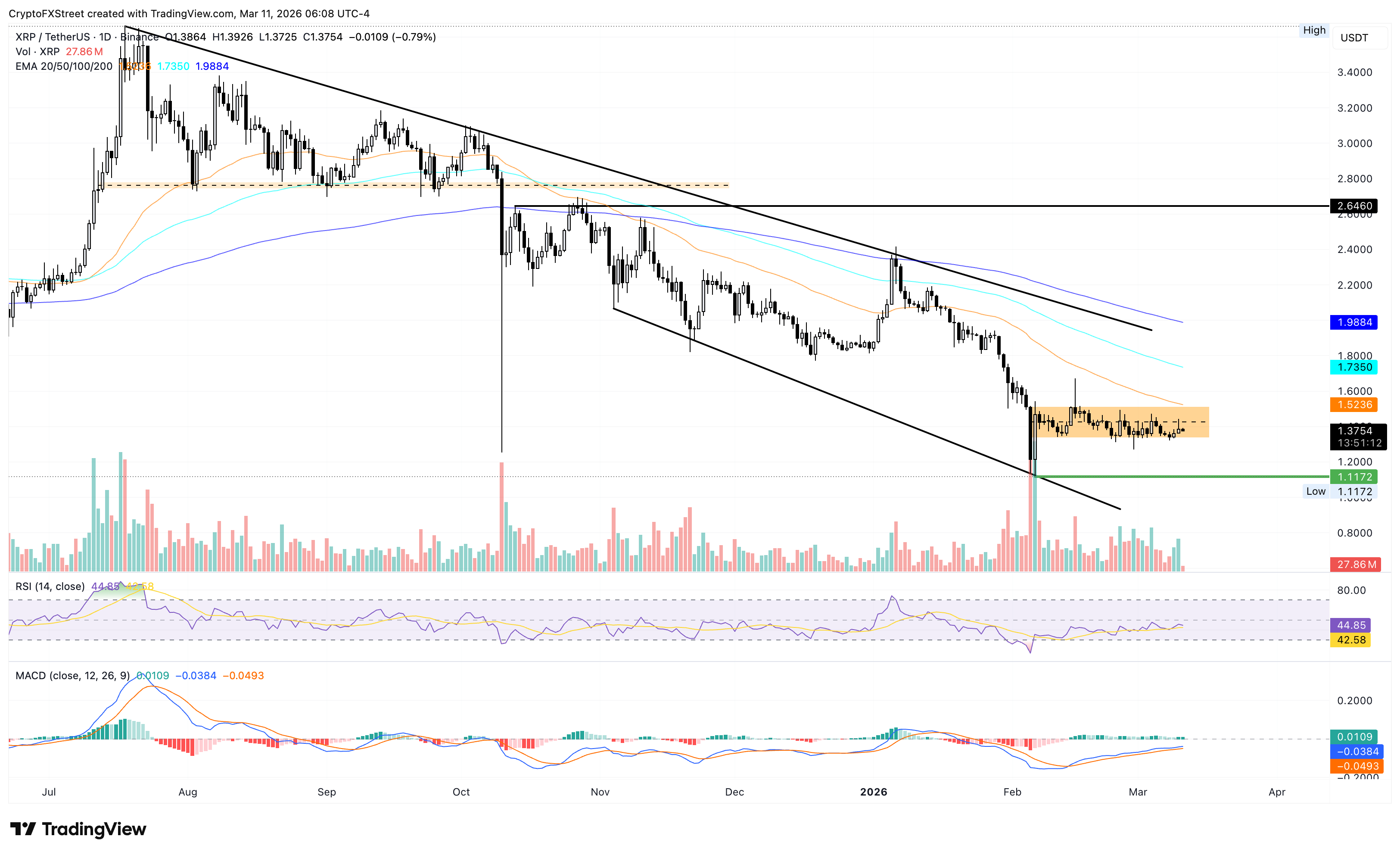 Ripple trades below $1.40 at press time on Wednesday, approaching the $1.3328 base of a consolidation range, with the upper ceiling at $1.5154. If XRP slips below $1.3328, it could threaten the February 6 low at $1.1172.