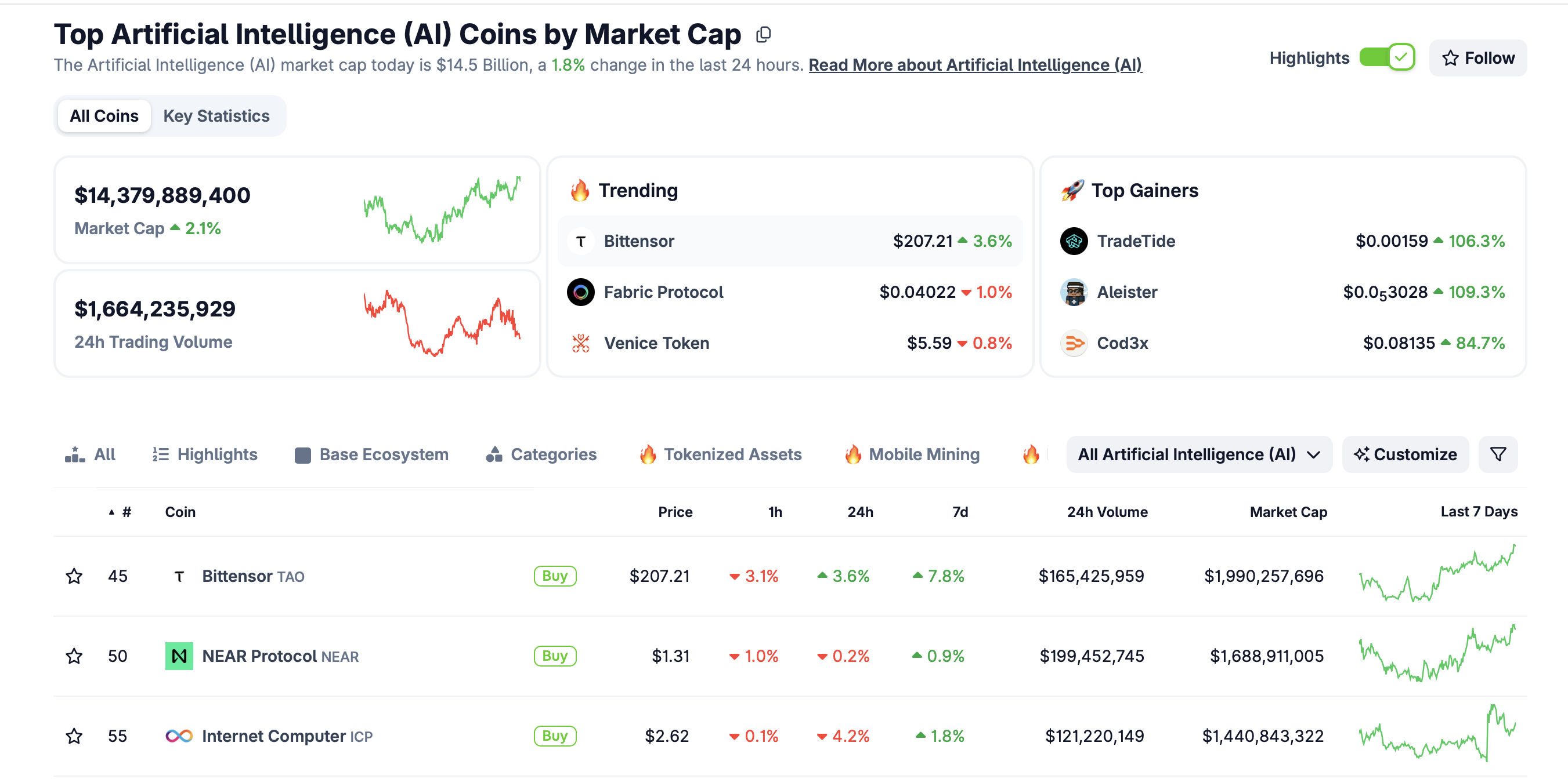 • The AI crypto segment’s market capitalization holds above $14 billion, signaling steady investor interest.