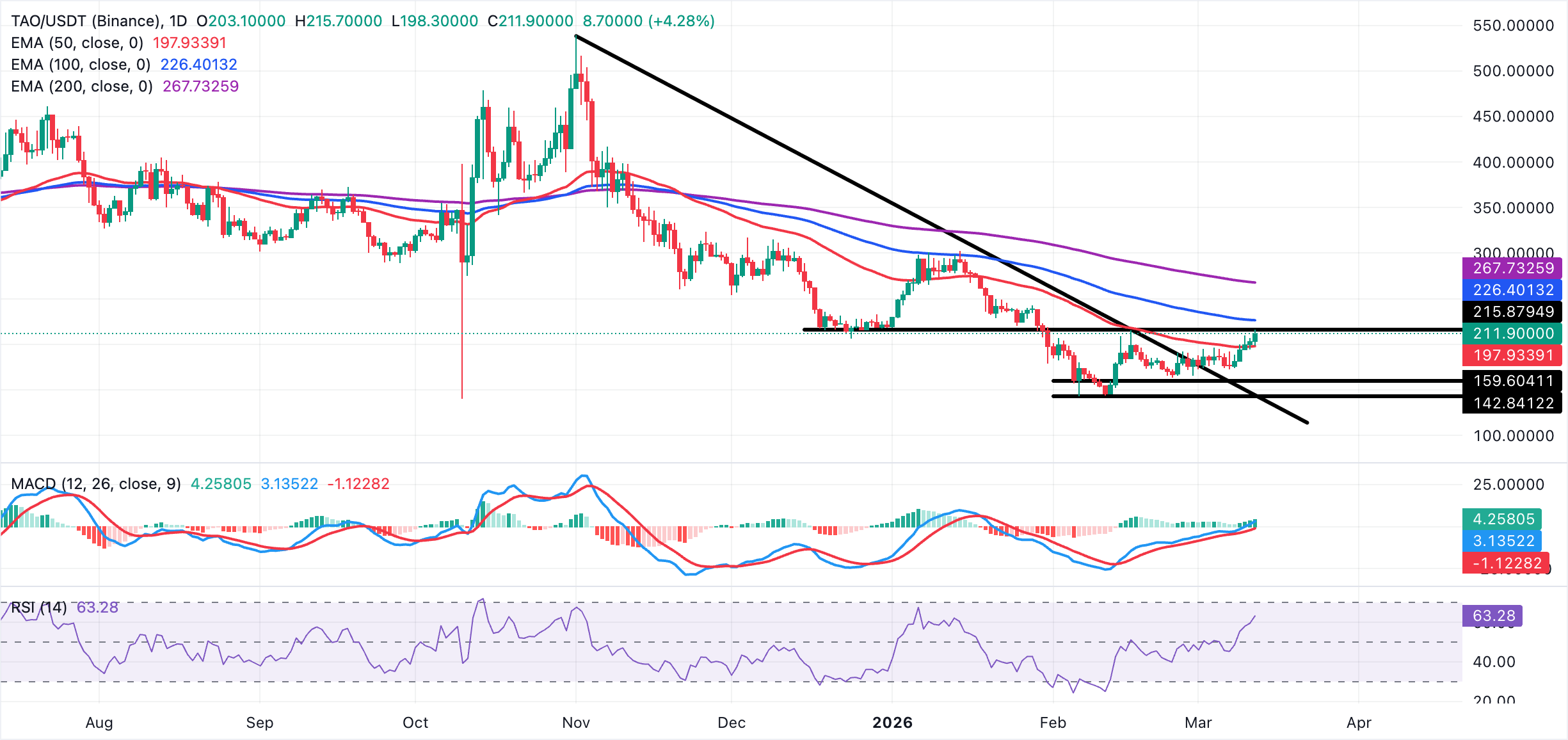 Bittensor (TAO) is trading above $210 at the time of writing on Thursday, reflecting the steadiness of the broader cryptocurrency market amid the United States (US)-Iran war.