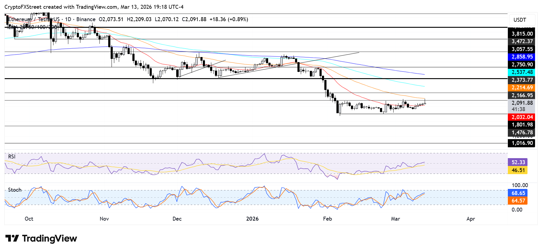 The Relative Strength Index (RSI) at 52 and a rising Stochastic Oscillator (Stoch) in the mid-60s confirm improving upside momentum after the mid-month rebound, suggesting buyers retain control as long as ETH defends its recent higher lows around the $1,950–1,970 area.