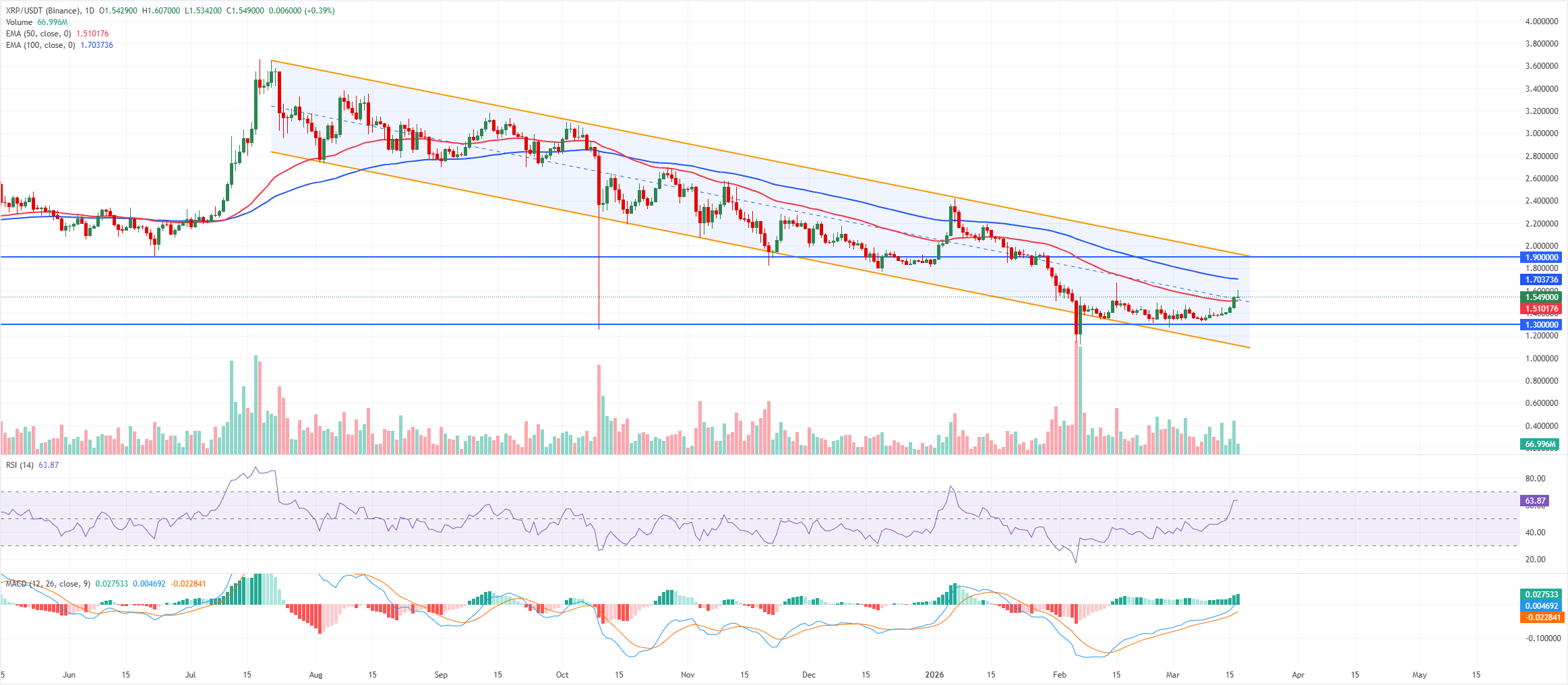XRP is trading at $1.54 on Tuesday after surging by more than 6% the previous day. XRP trades within a descending parallel channel that started above $2.80, but the latest rebound from near the $1.30 support and the push above the mid-$1.40s shifts the near-term bias to mildly bullish against that floor. Price now trades above the 50-day Exponential Moving Average (EMA) while remaining below the 100-day EMA, signalling an early recovery phase within a broader corrective structure.