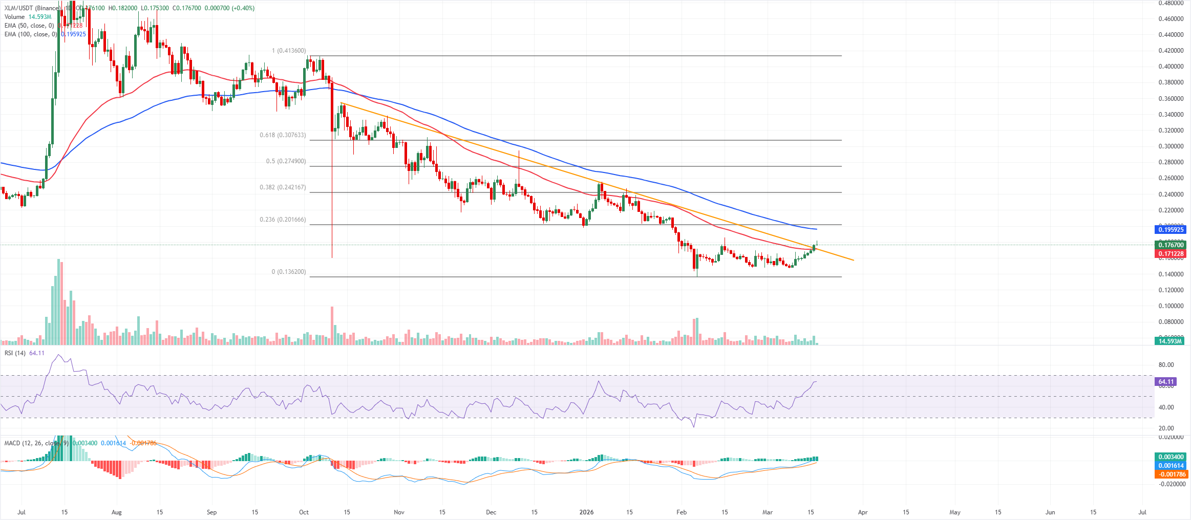 XLM price is trading at $0.176 on Tuesday after breaking above the descending trendline the previous day. The near-term bias is cautiously bullish after the price extended its rebound following recent consolidation and closed above the 50-day EMA at $0.171.