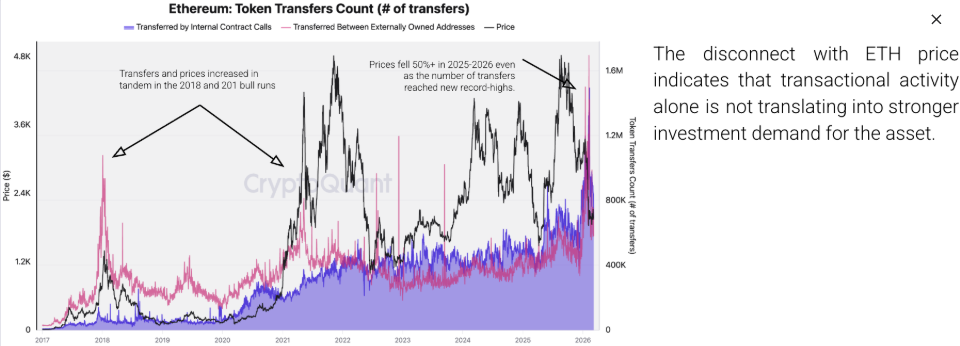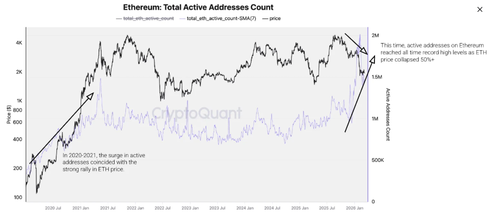 From on-chain data, Ethereum’s network activity has reached record highs, while its price has fallen by more than 55% from its all-time high of $4,956 in August 2025, indicating a clear divergence between network usage and asset performance.