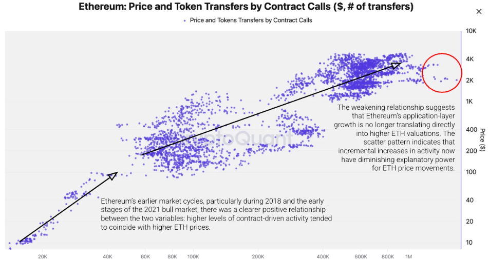 The analyst continued, “In earlier cycles, ETH price showed a clearer positive relationship with contract-driven activity, with higher transfer counts coinciding with rising prices. Over time, this relationship weakened. Indeed, the latest observations (red circle) cluster at high activity but relatively low prices, indicating a deterioration in the historical correlation to smart-contract activity.”