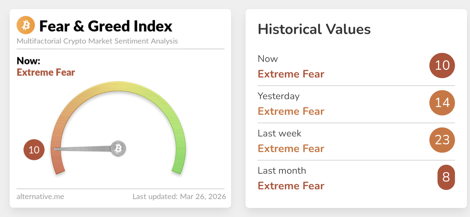 Sentiment in the cryptocurrency market remains weak as a risk-off mood triggers capital flight. The Crypto Fear & Greed Index holds at 10 on Thursday in the extreme fear territory, down from 14 the previous day.