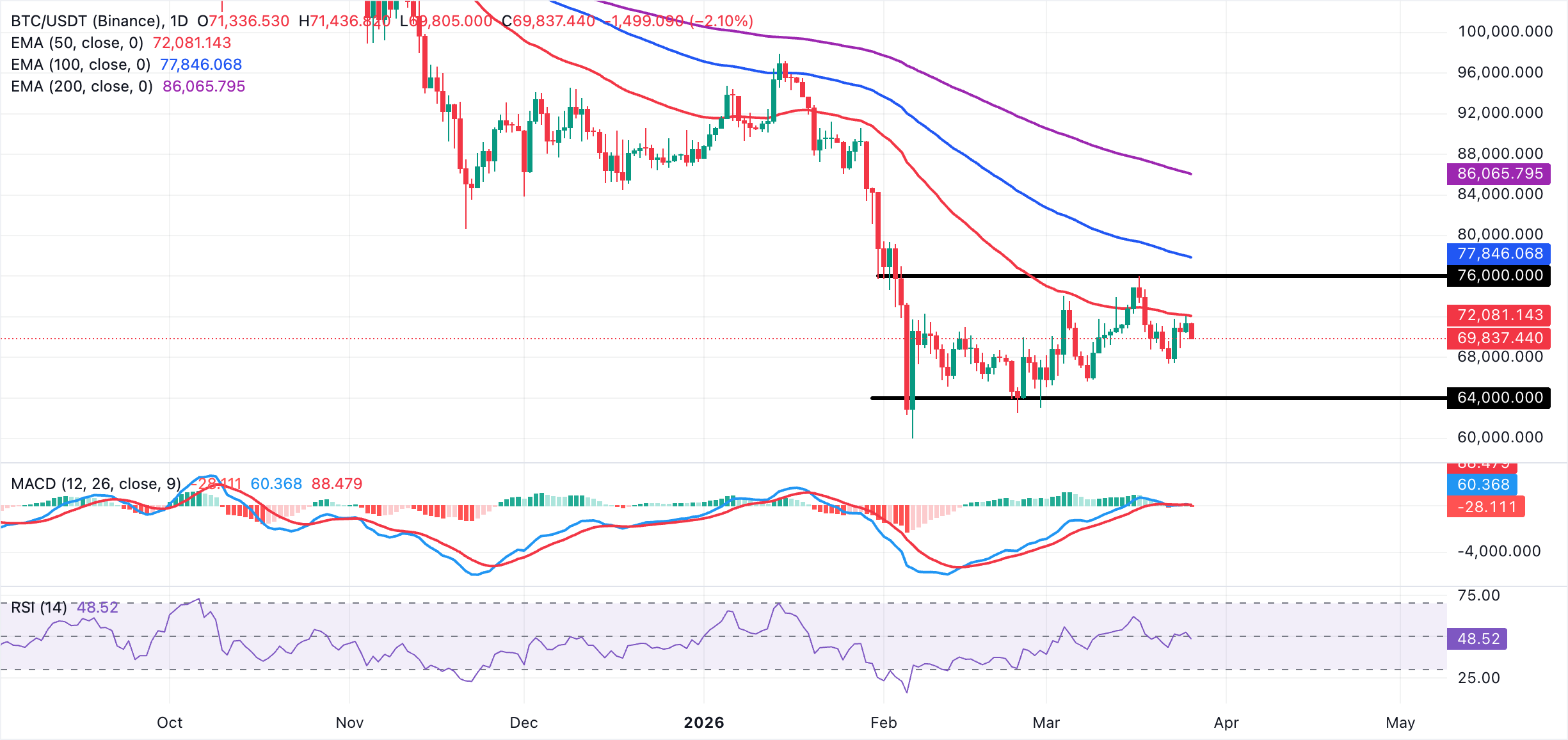 Bitcoin is trading slightly below $70,000, with its near-term outlook turning mildly bearish. The price appears to be consolidating in a range below the clustered 50-day, 100-day, and 200-day Exponential Moving Averages (EMAs), which sit between roughly $72,000 and $86,000 and cap the broader trend.