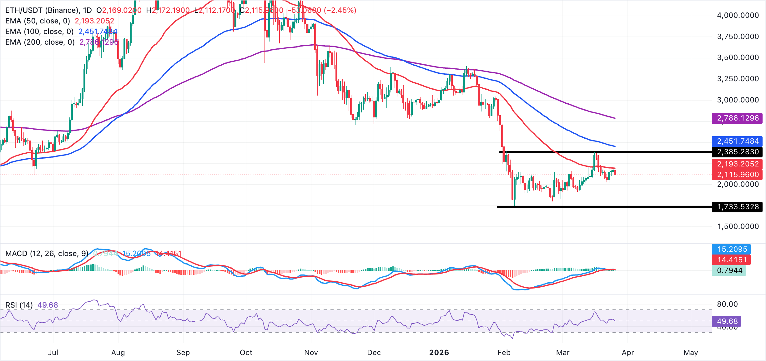 Immediate resistance appears at the 50-day EMA around $2,193, where sellers capped the latest push and where failure to regain traction would keep rallies short-lived. A subsequent barrier is seen in the $2,350–$2,385 area, which coincides with the March high.