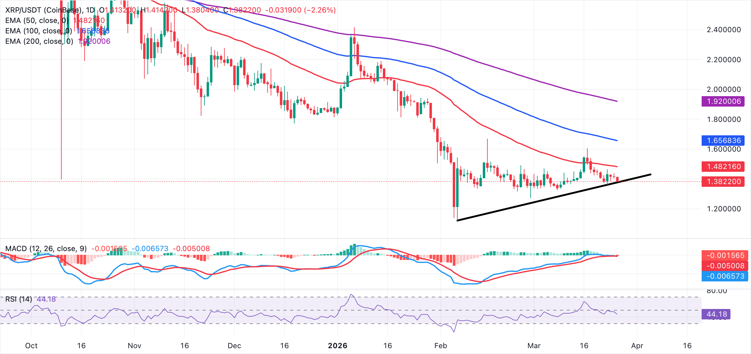 Ripple (XRP) similarly paints a grim picture, grinding lower at $1.38 within a weakening technical structure.