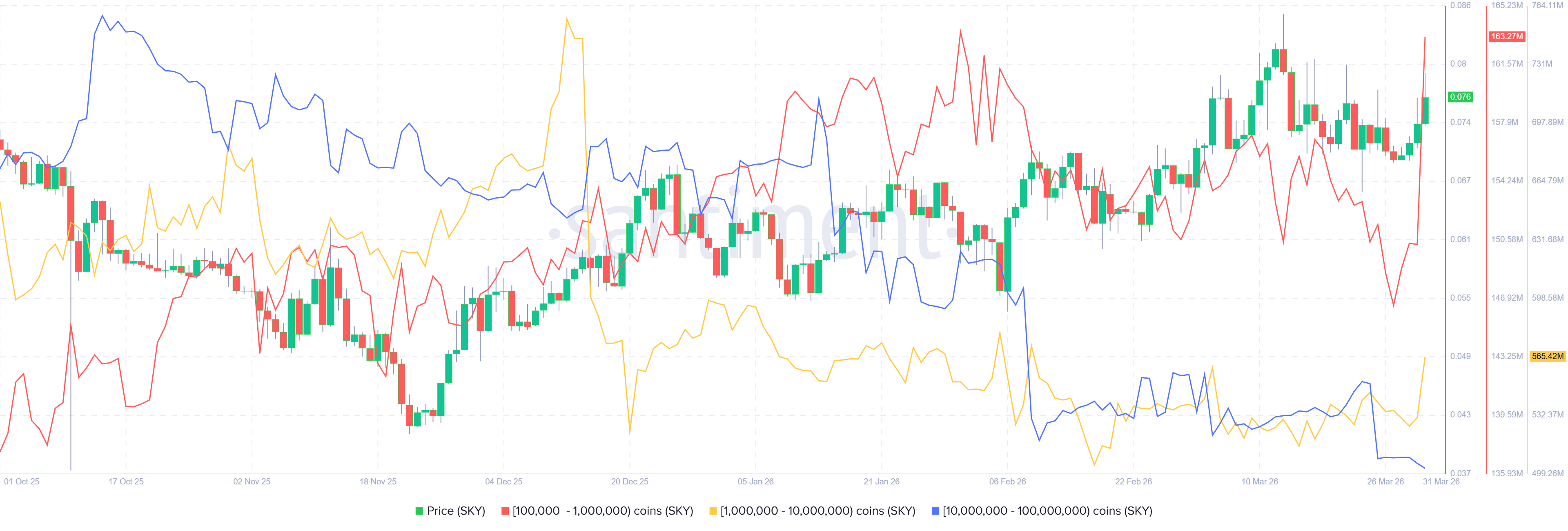 Sky (SKY) surges by more than 5% on Tuesday following the Upbit exchange listing of Sky Protocol, boosting sentiment. In addition, rising whale accumulation alongside increasing Open Interest (OI) further strengthens the bullish outlook for SKY.