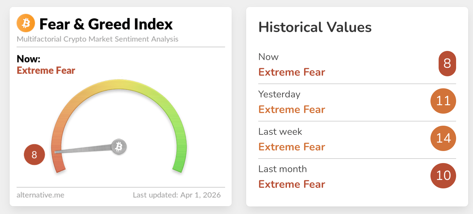 Sentiment, as reflected in the Fear & Greed Index, which shows a reading of 8 on Wednesday, has remained in extreme fear territory since March 19. There was a brief spike to 28 on March 17, but the index retreated, signaling that the broader crypto market sentiment remains weak.