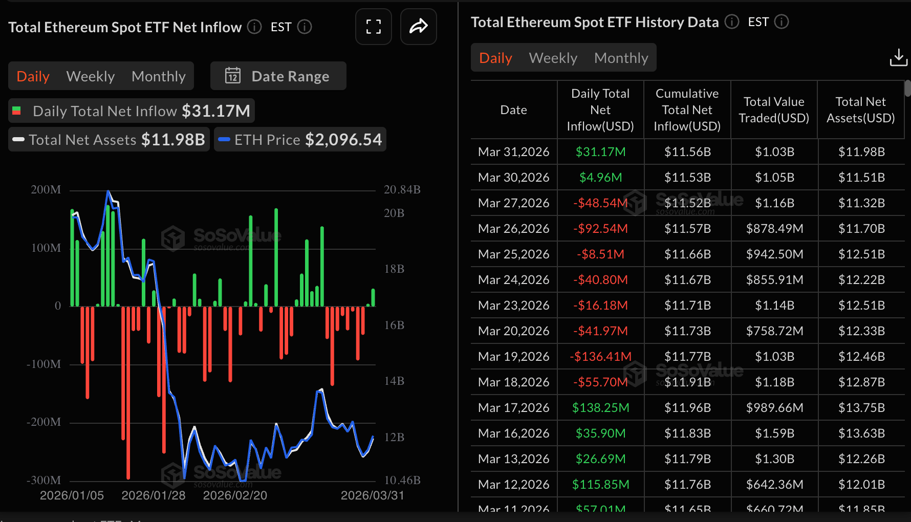 Ethereum similarly recorded inflows of roughly $31 million on Tuesday, from nearly $5 million on Monday. SoSoValue data shows cumulative inflows totaling $11.56 billion, while net assets average $11.98 billion.