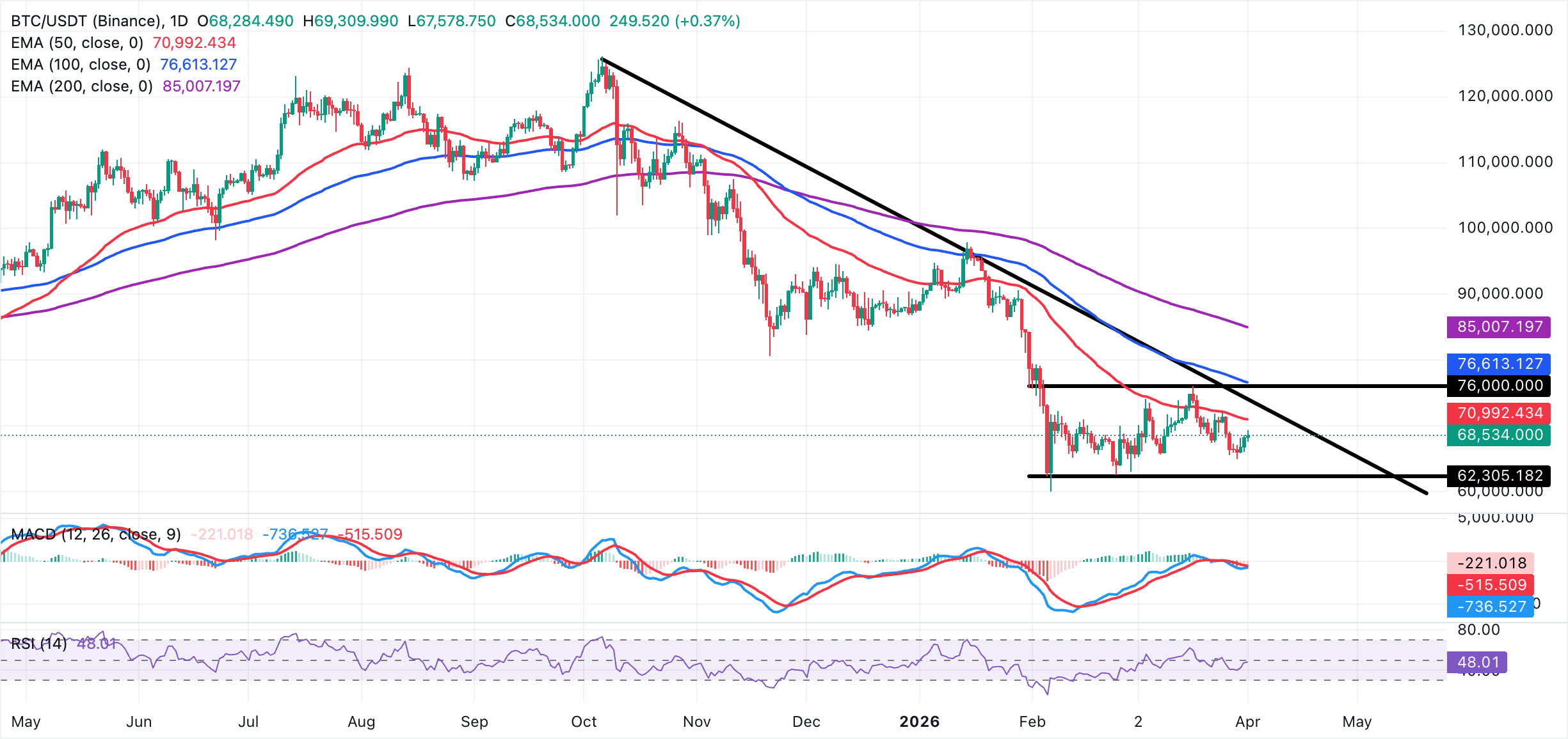 Bitcoin's immediate resistance lies at the 50-day EMA around $71,000, followed by the recent high zone near $72,800 and the descending trendline break area at $73,900. A daily close above that cluster would reopen the path toward the March high of $76,000. On the downside, initial support is seen around $68,000, ahead of the late-March lows near $65,000. A break below $65,000 would expose deeper retracement toward the yearly low at $60,000.