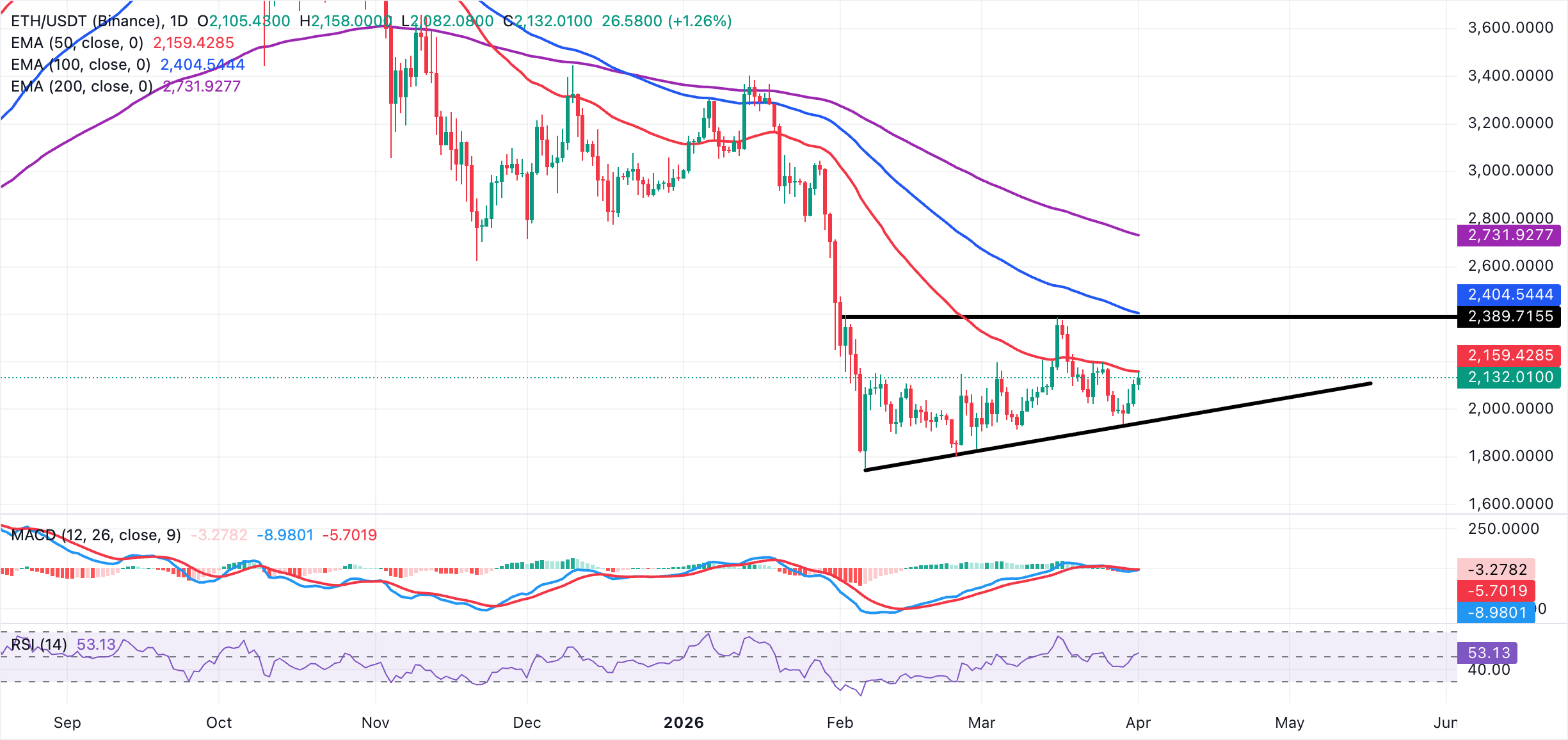 Ethereum is trading above $2,100 at the time of writing on Wednesday. Its near-term bias is mildly bullish as price holds above the rising support trendline that originates near $1,745, keeping the broader recovery structure intact despite recent consolidation. The 50-day EMA around $2,160 flattens just above spot, capping immediate upside for now, while the 100-day and 200-day EMAs are well above $2,400 and $2,700, respectively, and still reflect a longer-term corrective backdrop.