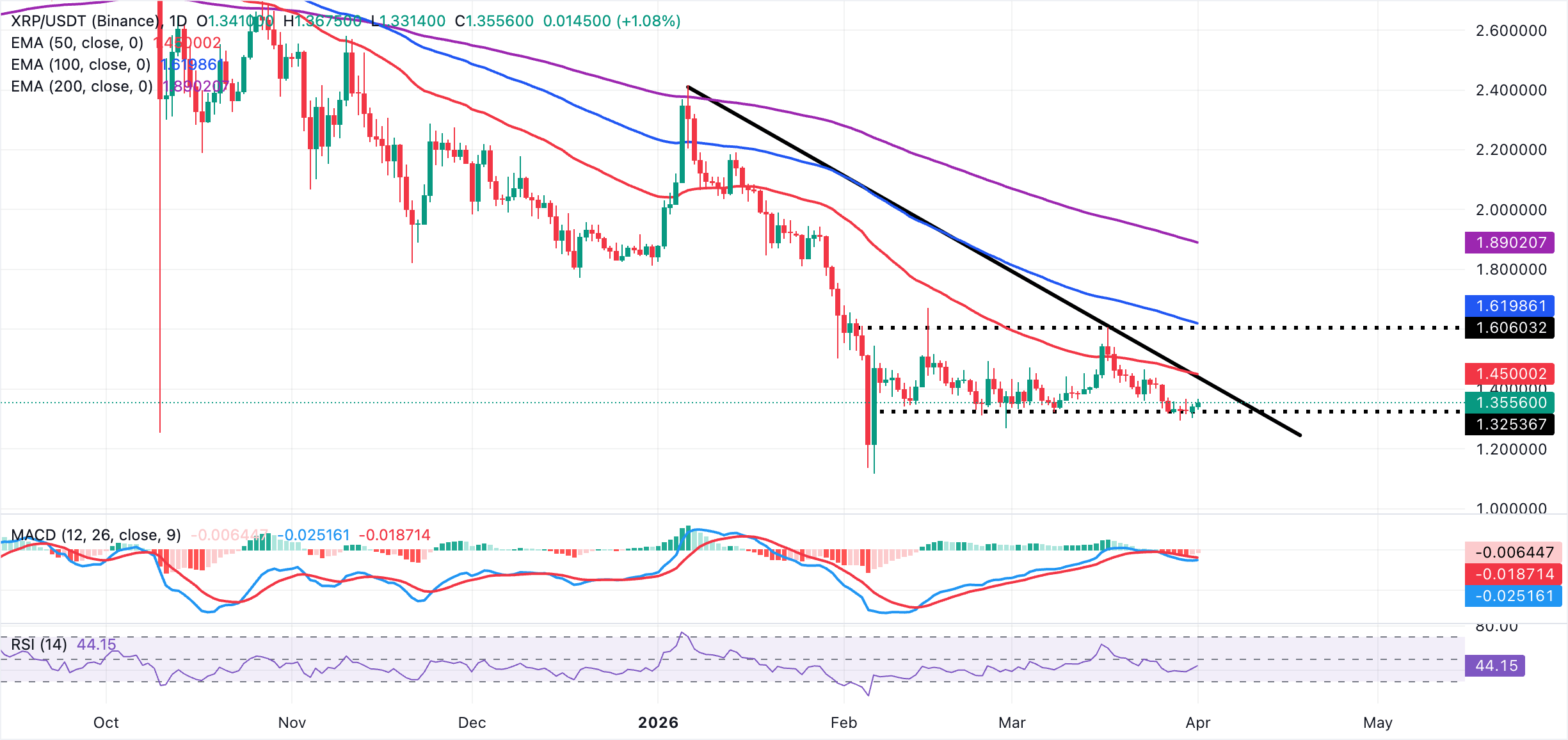 As for XRP, the price holds above $1.35, with a near-term bias mildly bearish as it sits below the downward-sloping trendline. The latest rejection occurred near $1.44 and remains capped by the 50-day, 100-day, and 200-day EMAs, which are clustered between $1.45 and $1.90.
