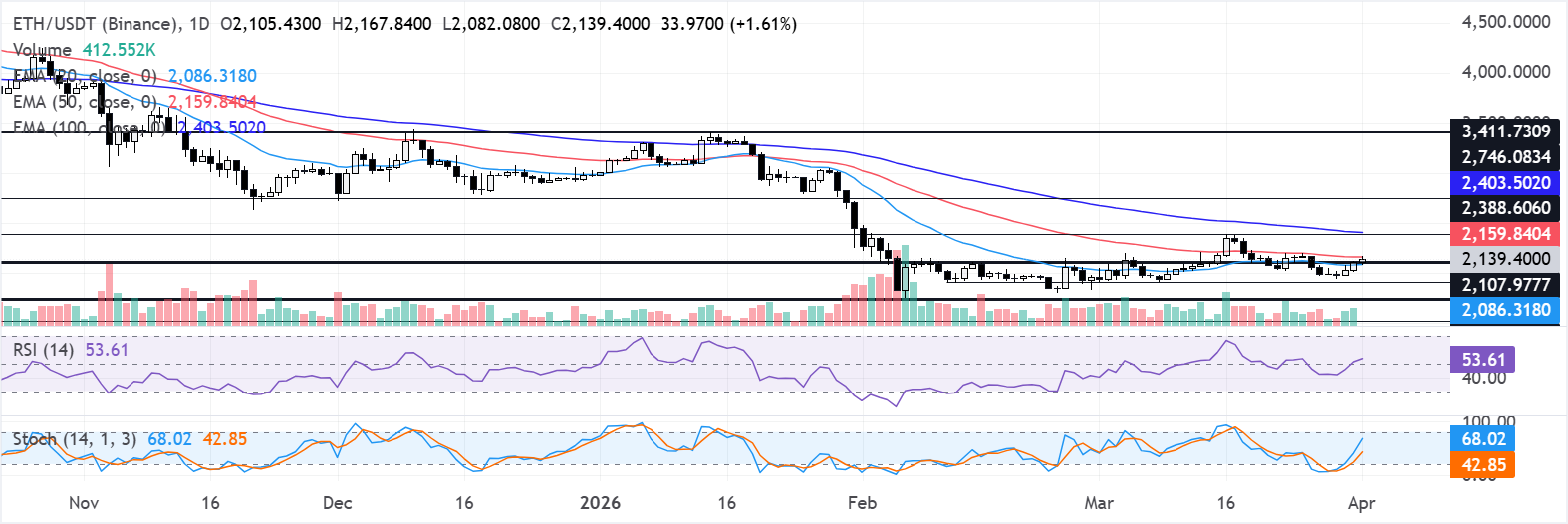In the daily chart, ETH trades at $2,130. The near-term bias is mildly bullish as price holds above the 20-day Exponential Moving Average (EMA) near $2,085 while stabilizing after the recent pullback. The 50-day EMA around $2,160 caps the immediate upside and defines the boundary of a developing recovery phase beneath the still-declining 100-day EMA near $2,400.