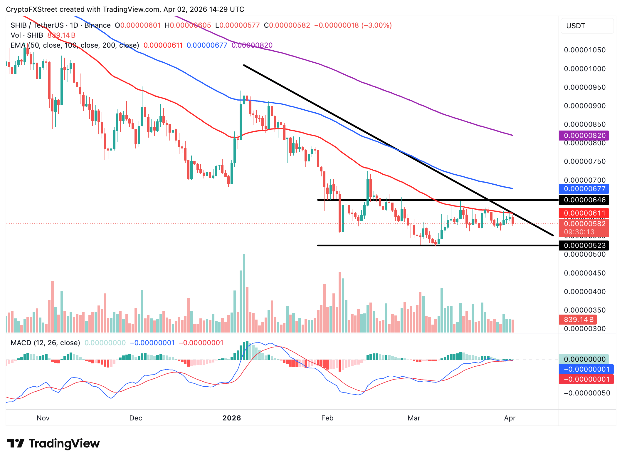 Shiba Inu is trading around $0.0000058 amid a neutral-to-bearish outlook. The price holds below the descending 50-day, 100-day and 200-day Exponential Moving Averages (EMAs), clustered between $0.0000061 and $0.0000082.