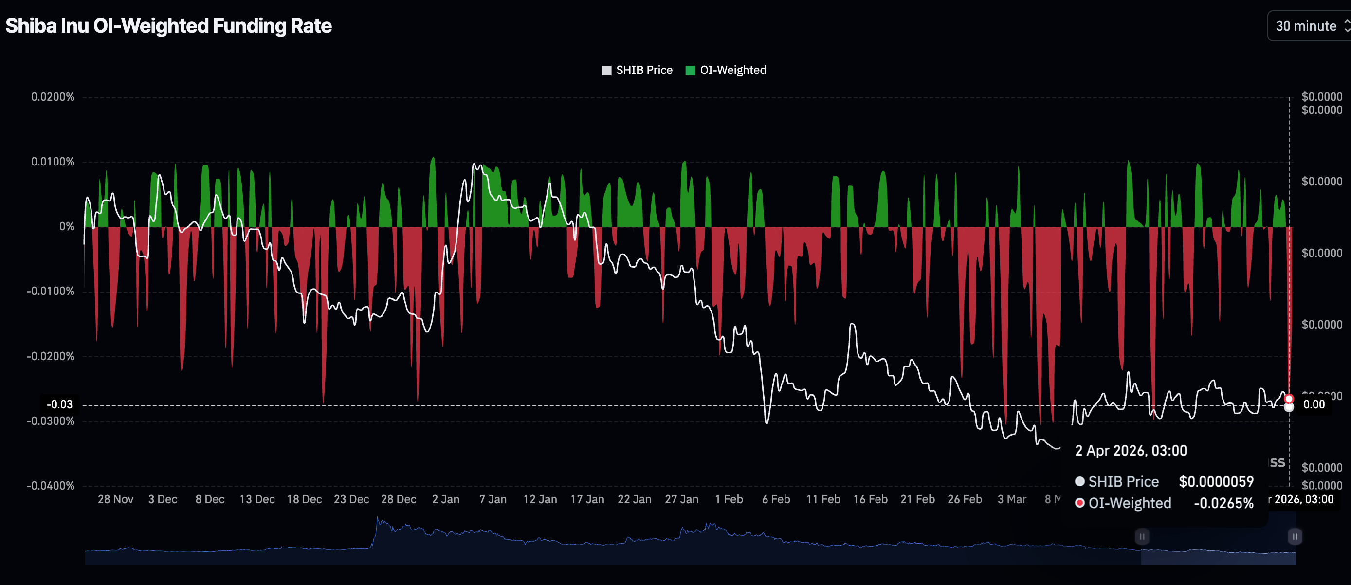 Interest in Shiba Inu derivatives is on the back foot, as reflected by the Open Interest (OI)-Weighted Funding Rate, which stands at -0.0265% on Thursday, indicating that bearish bets currently outweigh bullish exposure. The drop into negative territory also suggests that bullish conviction is cooling as the market transitions to a more bearish stance.