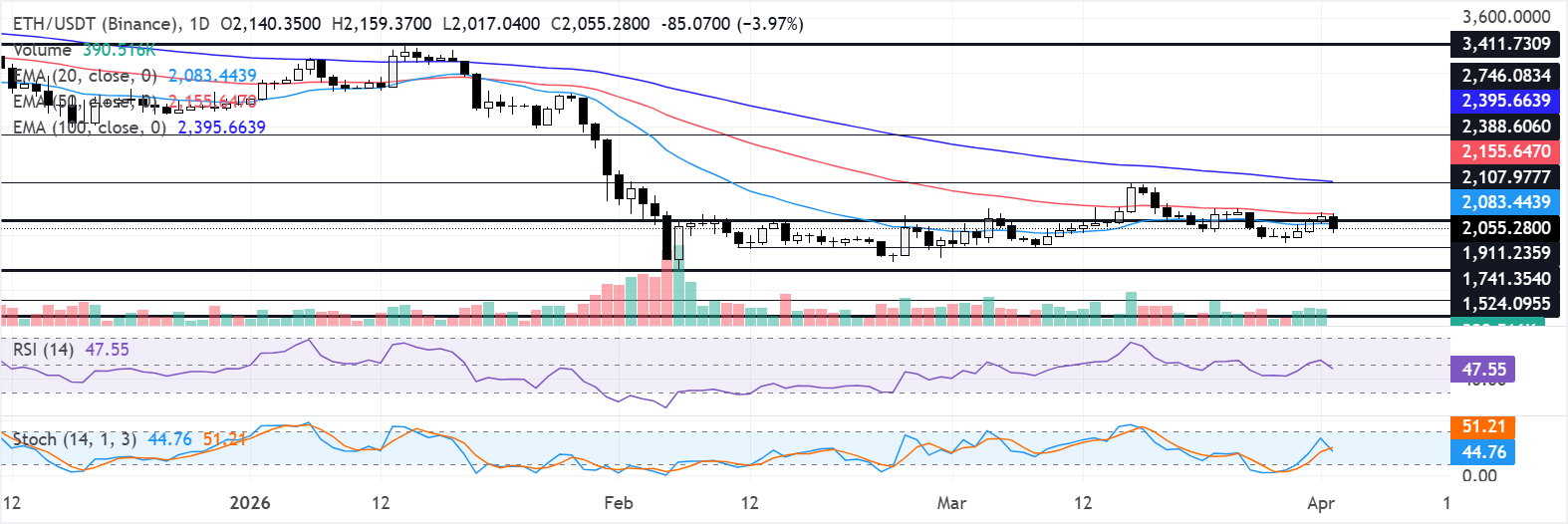 Immediate resistance is at the nearby horizontal cap at $2,108, followed by $2,389 and then $2,746. A daily close above $2,108 would be the first step to ease pressure and expose the higher resistance band toward the 100-day EMA and $2,389.