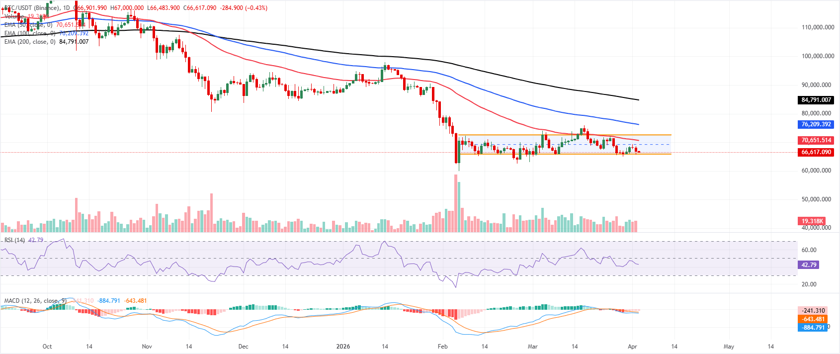 On the upside, initial resistance emerges near the midpoint of the channel, around $69,200, just ahead of the channel top near $72,600, where the consolidating boundary tops roughly converge with the 50-day EMA to form a key barrier. A daily close above $72,600 would signal a bullish break from the sideways structure and open the door toward the 100-day EMA near $76,200, while sustained trade below $65,900 would extend the current corrective leg within the broader cycle.