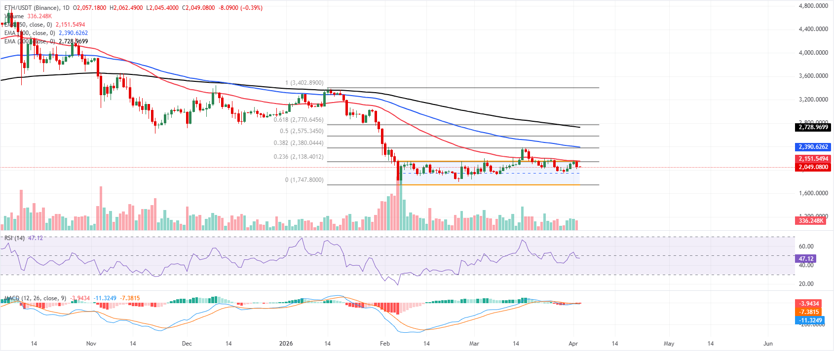 Ethereum price is trading at $2,049 on Friday. The near-term bias stays bearish as price holds well below the horizontal channel top near $2,148 and remains capped under the 23.6% Fibonacci retracement at $2,138, measured from the $1,747 low to the $3,402 high. The cluster of 50-day, 100-day, and 200-day EMAs above $2,150 highlights a firmly dominant higher-timeframe downtrend weighing on rebounds.
