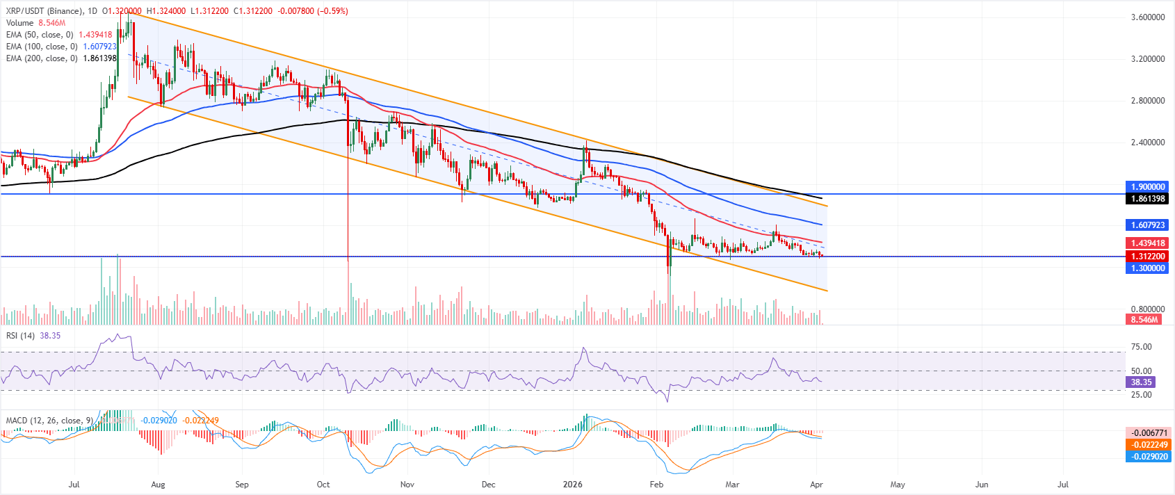 XRP price is trading at $1.31 on Friday. The near-term bias is mildly bearish as price holds near the lower half of the established descending channel, with spot anchored well below the 50-day, 100-day, and 200-day EMAs, which continue to fan out above the market.