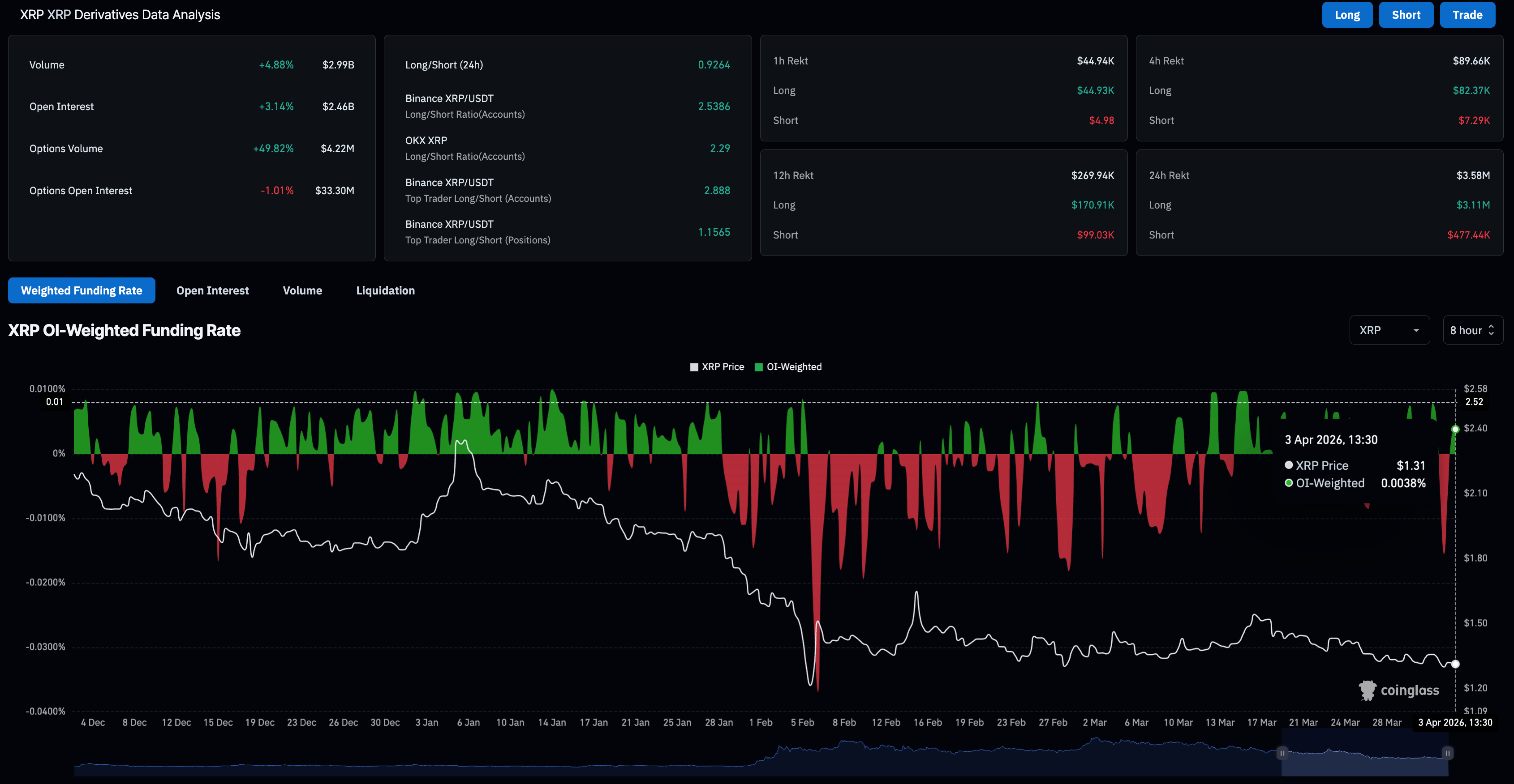 XRP derivatives data shows increased trading activity amid a broader bearish bias. Liquidations over the last 24 hours totaled $3.58 million, led by $3.11 million of long liquidations. That dropped the long-to-short ratio to 0.9264, which reflects a larger number of active short positions.