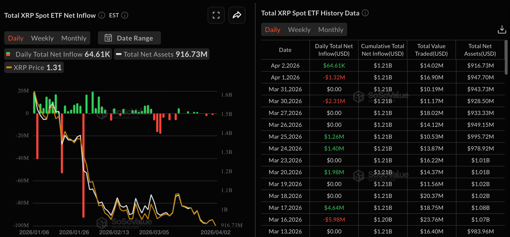 Meanwhile, the XRP ETFs recorded an inflow of $64,610 on Thursday, after a $1.32 million outflow on Wednesday. This marks the first inflow since March 26, while the monthly outflow from March totaled $31.16 million.