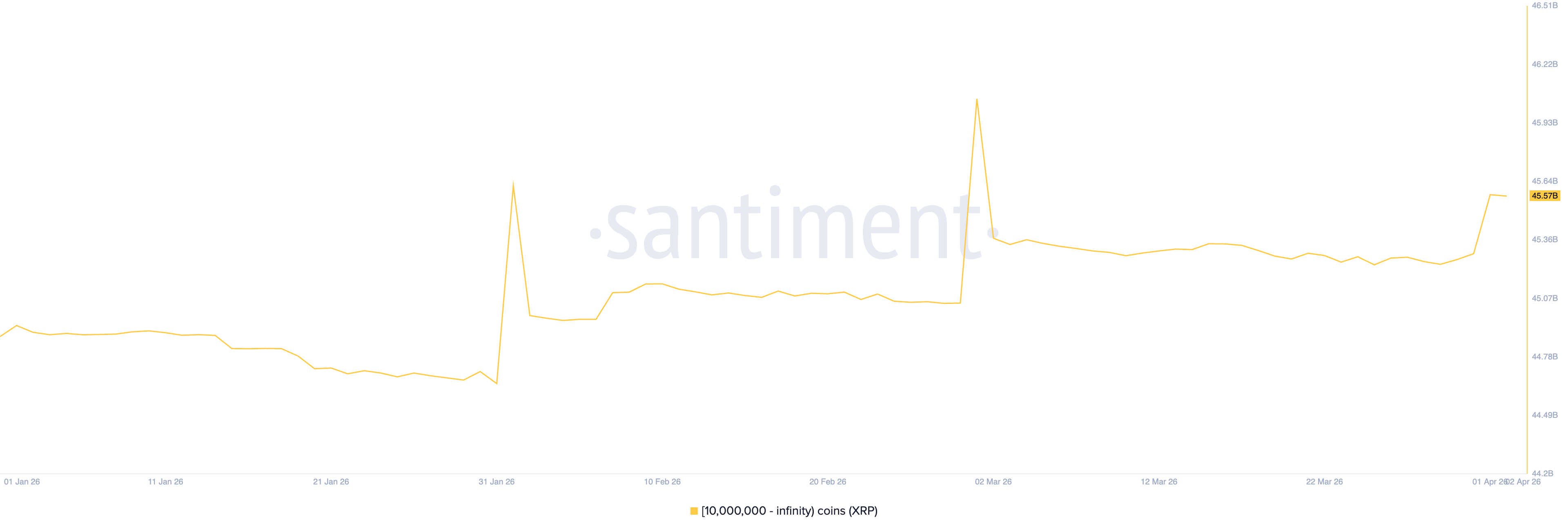 On-chain data shows large wallet holders maintain a steady buy-the-dip strategy. According to Santiment, wallets holding more than 10,000 XRP now hold 45.57 billion tokens, up from 45.29 billion on Tuesday.