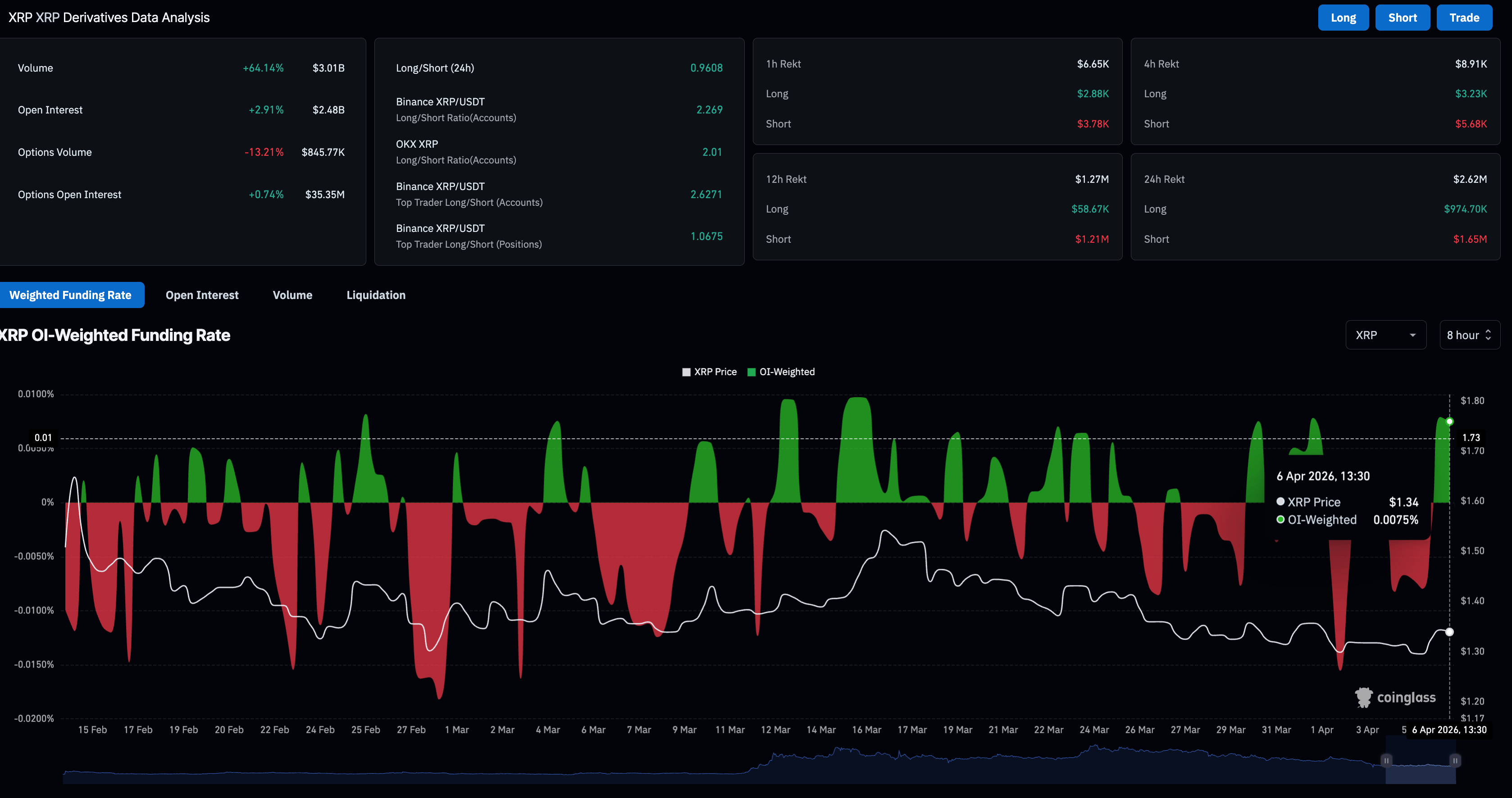 XRP gains strength on Monday as Bitcoin (BTC) rallies above $69,000 on hopes of a potential ceasefire in Iran. CoinGlass data shows the XRP futures Open Interest (OI) stands at $2.48 billion, up nearly 3% in the last 24 hours, indicating an increase in the notional value of outstanding XRP perpetuals linked to elevated leverage or positional buildup. Meanwhile, the OI-weighted funding rate at 0.0075% suggests that traders are inclined to hold long positions.