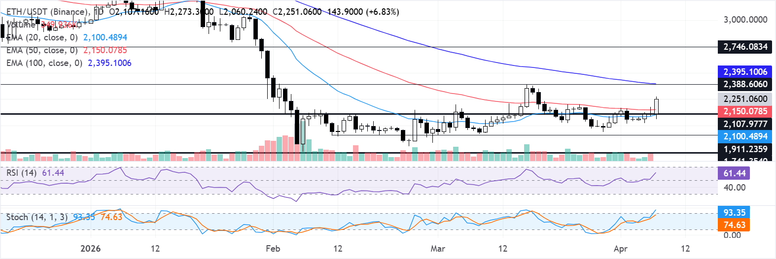 In the daily chart, ETH trades at $2,240. The top altcoin sits just above the 20-day Exponential Moving Average (EMA) near $2,090, while the 50-day EMA around $2,145 flattens, pointing to a mildly bullish bias within a broader corrective context below the distant 100-day EMA.