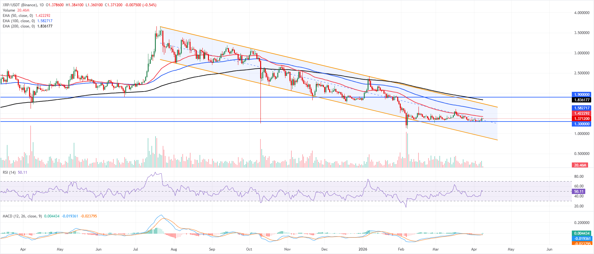 XRP price is trading at $1.37 on Wednesday, up 4.35% from the previous day. XRP remains embedded in a descending channel from above $2.80, keeping the broader structure bearish while price holds well below the upper boundary near $1.74. Daily closes continue to track under the clustered 50-day, 100-day and 200-day EMAs, reinforcing downside pressure despite last session’s modest rebound.