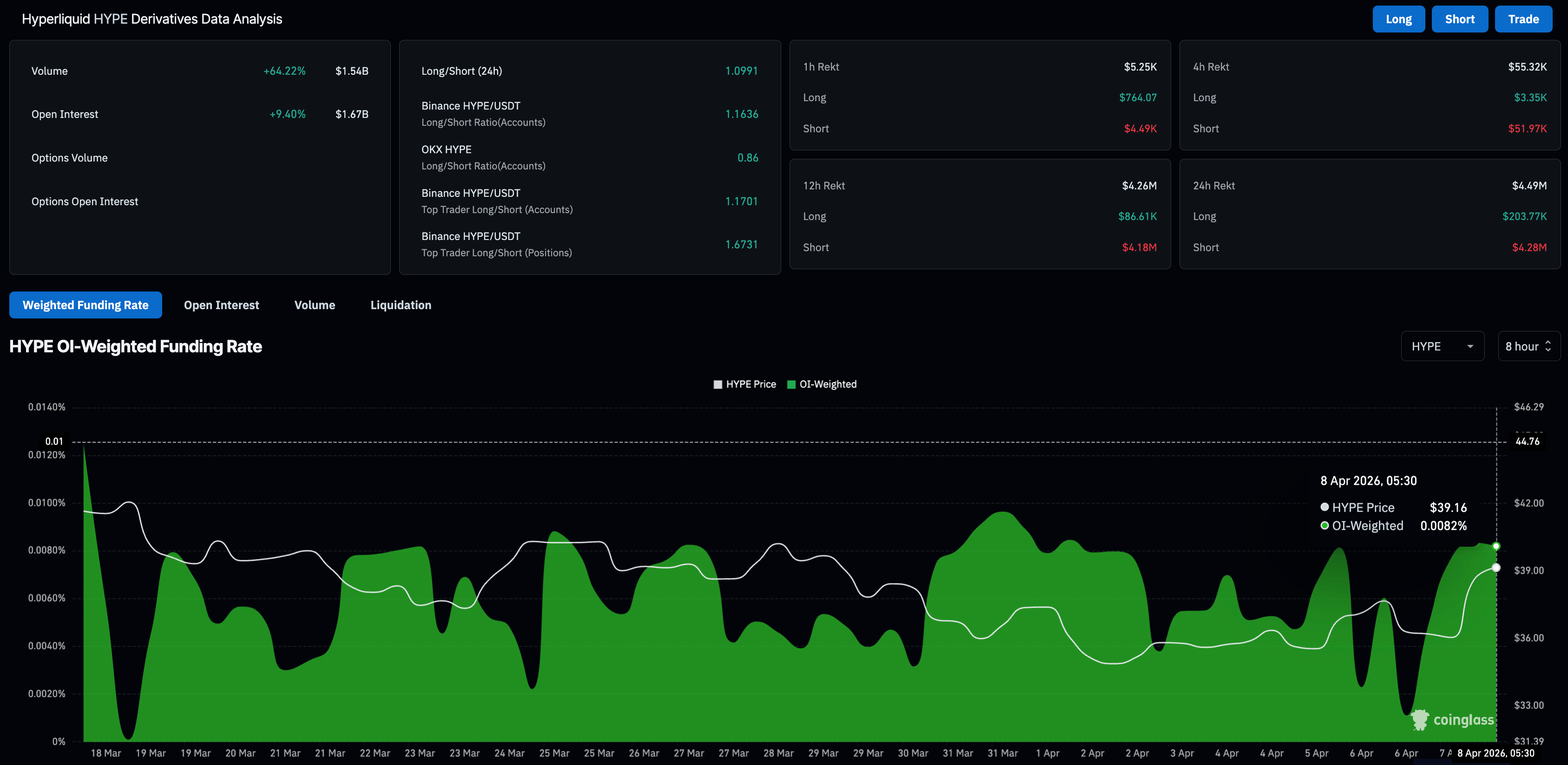 CoinGlass data shows the HYPE futures Open Interest (OI) stands at $1.67 billion on Wednesday, up over 9% in the last 24 hours. Typically, an OI expansion during a spot market recovery signals latent demand entering the leverage market.