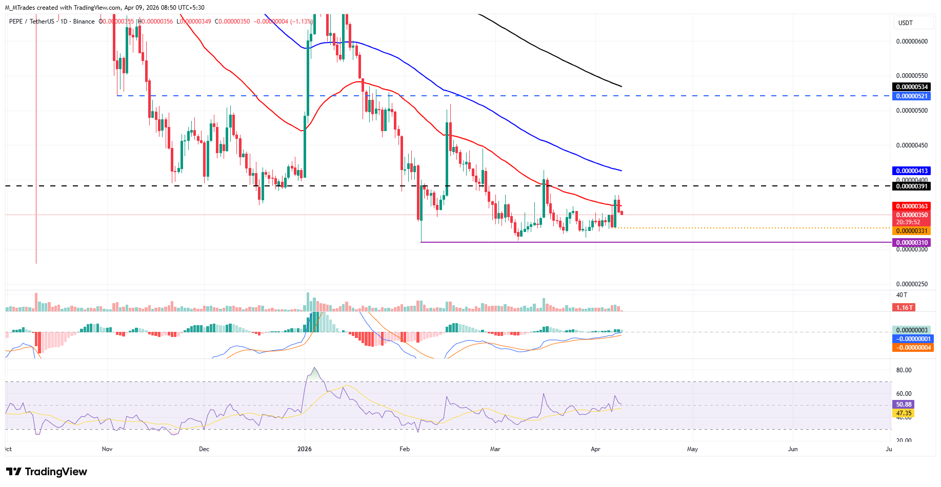 If PEPE recovers, it could extend the advance toward the 50-day EMA at $0.0000036.