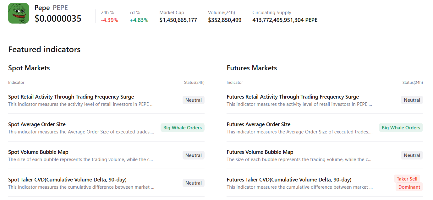 PEPE’s CryptoQuant summary data shows mixed conditions with early signs of bearishness. Activity across futures markets suggests sellers’ dominance, reflecting negative sentiment among investors. However, the presence of large whale orders in spot and futures markets suggests a slightly optimistic outlook for Pepe.