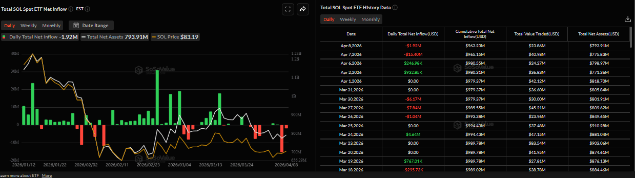 Solana (SOL) extends the correction, trading below $82 at the time of writing on Thursday after being rejected from key resistance the previous day. Institutional demand continues to weaken, as SOL spot Exchange Traded Funds (ETFs) recorded an outflow on Wednesday, following the largest single-day withdrawal since their launch. Weakening derivatives data alongside a bearish technical outlook suggest further losses ahead.