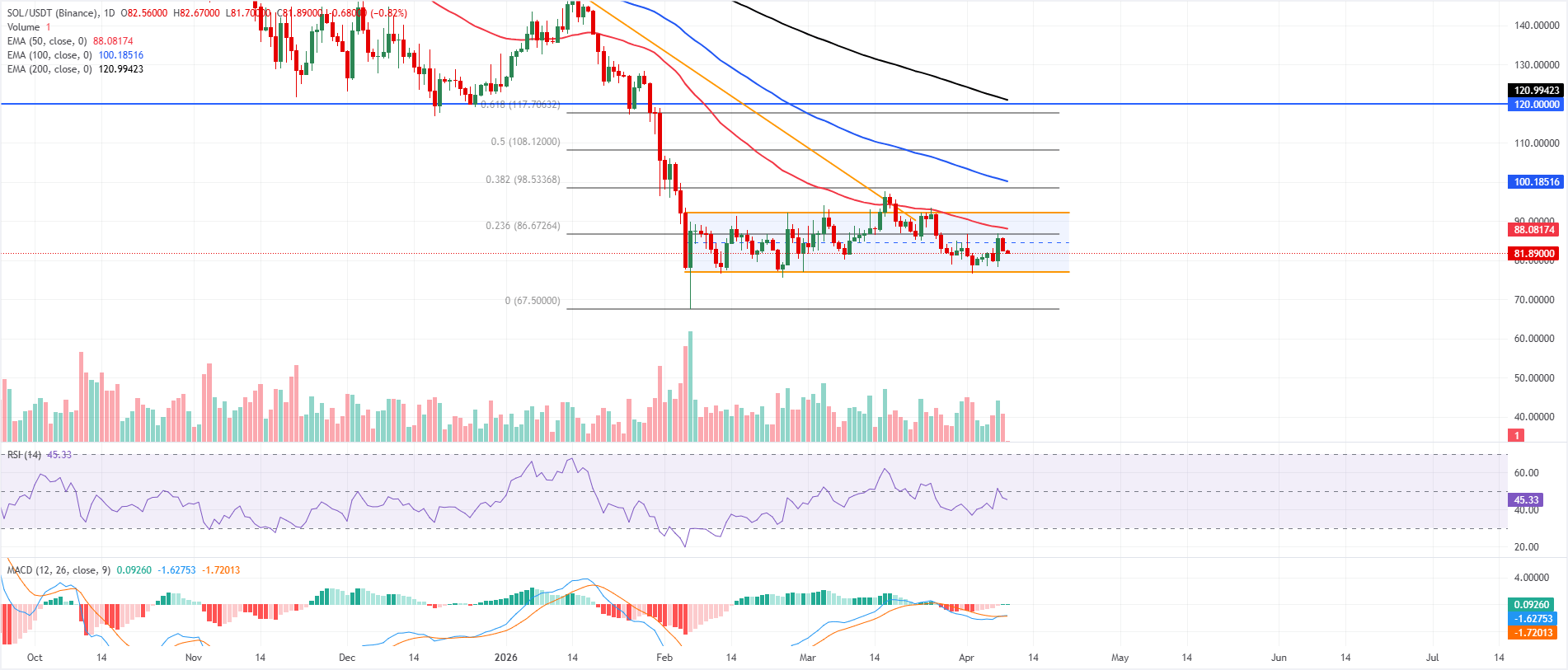 Solana price trades at $81.88 on Thursday, keeping a bearish near-term bias as price holds beneath the 50-day Exponential Moving Average (EMA) at $88.08 and the 100-day EMA near $100.19, while the 200-day EMA is around $120.99 and the horizontal barrier at $120.00 reinforce the broader topside cap.
